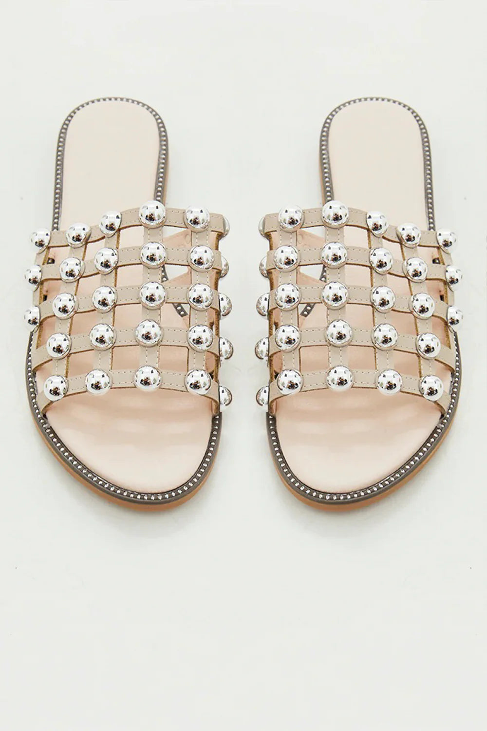 Women’s flat studded sandals. White pu sandals with cut out cage strap finished with silver stud detailing.