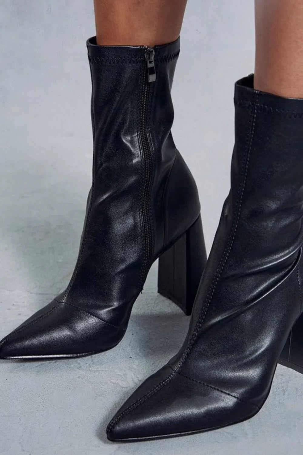 Black Block Heel Ankle High Boots With Pointed Toe & Side Zip