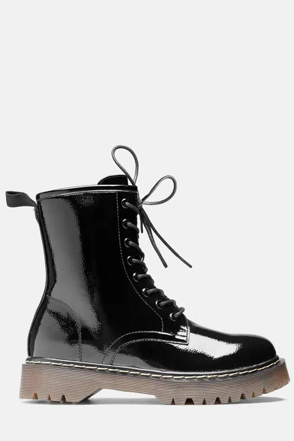 Women’s Chunky sole ankle boots with front lace up detail and inside zip fastening in a black patent finish.