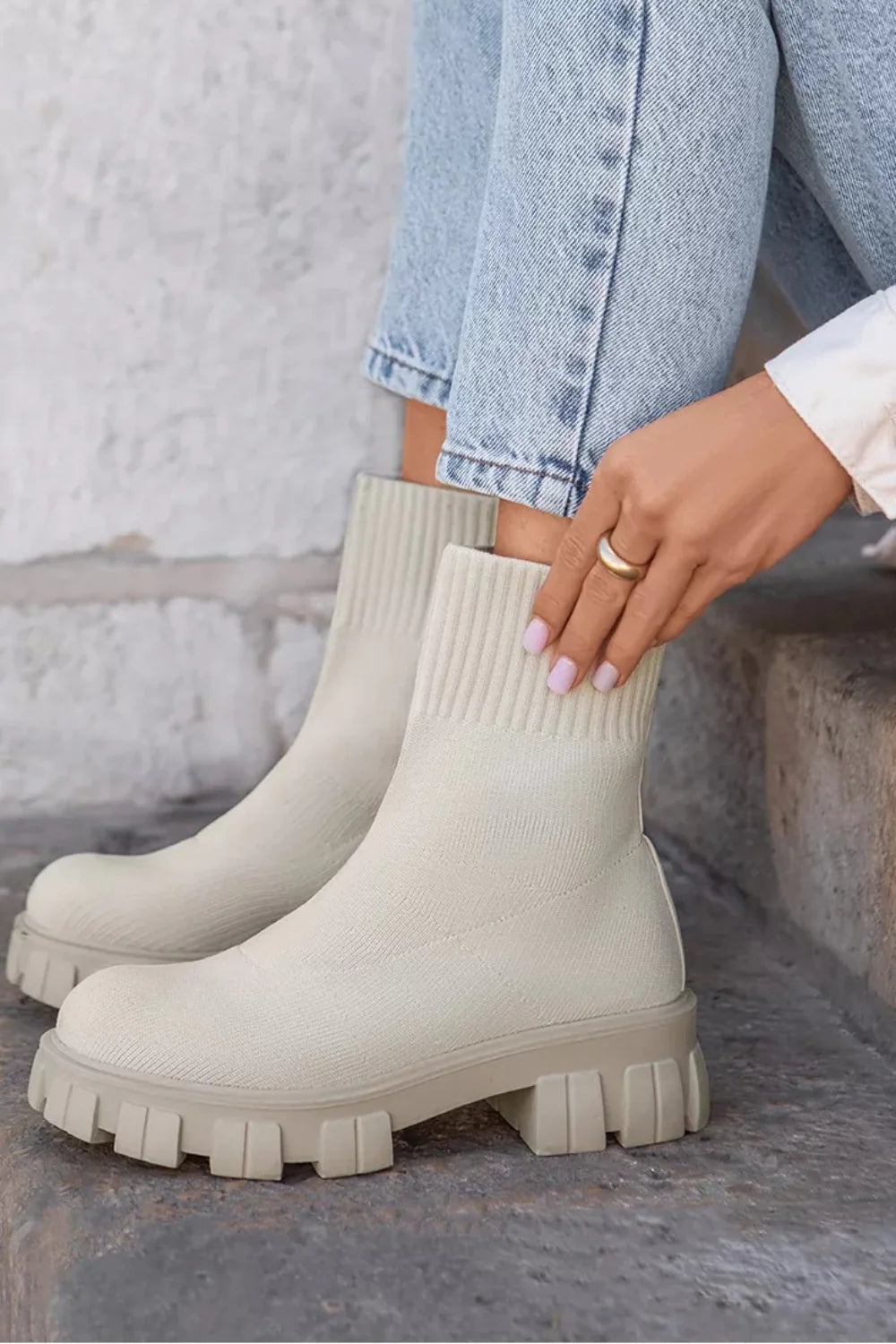 Cream Knitted Sock Pull On Chunky Ankle Boot