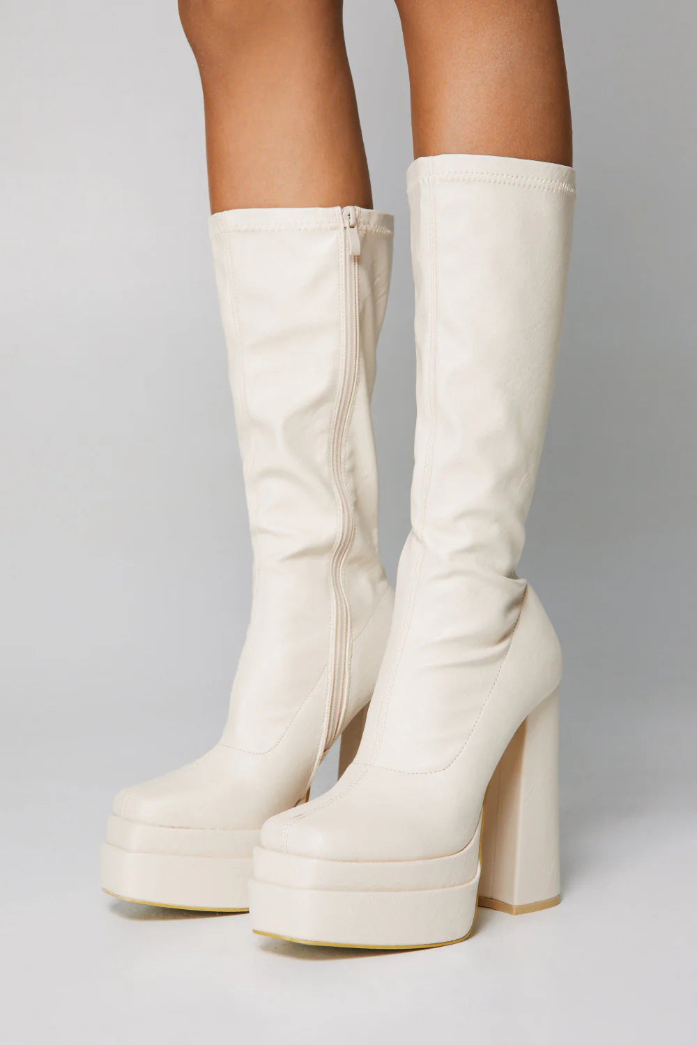 Step out in style with these cream PU square toe high heeled boots. Brought to you in a cream PU material with a square toe design, what's not to love? This heeled boots is adding all the luxe vibes to your look. Team with your go-to outfit of the day to elevate the look even further.