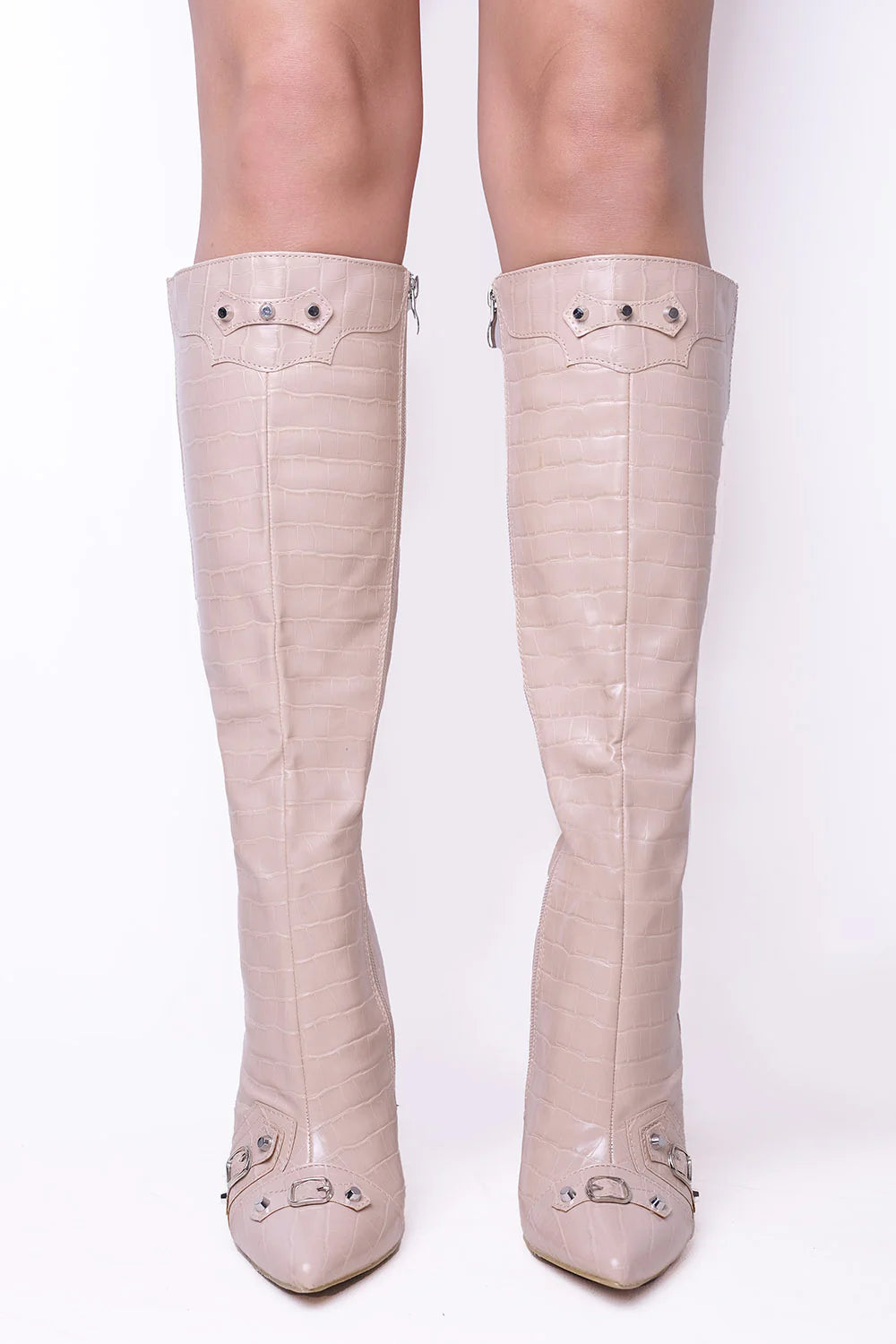 Nude Croc Calf High Heel Boots With Pointed Toe & Side Zip