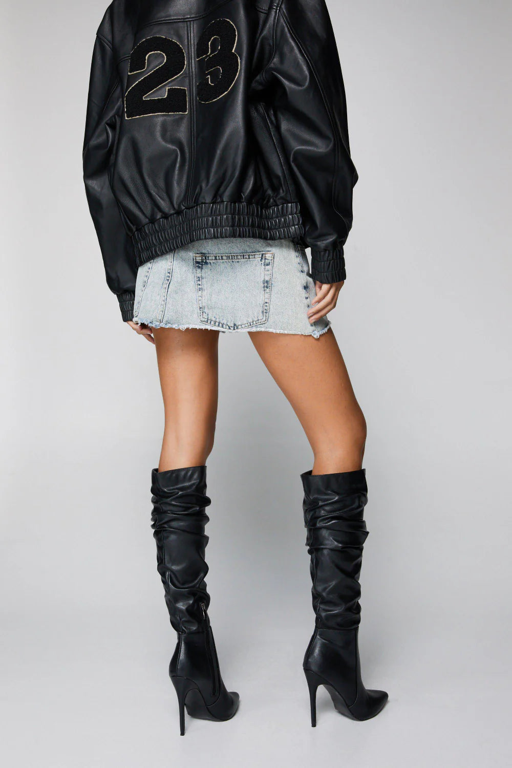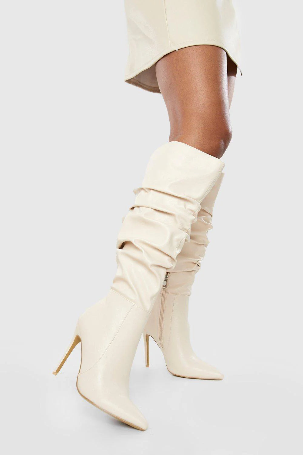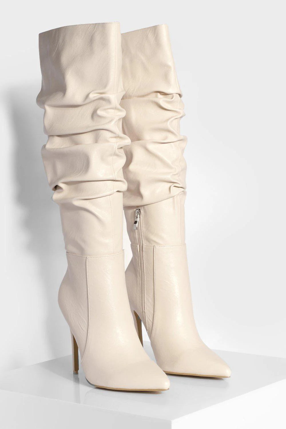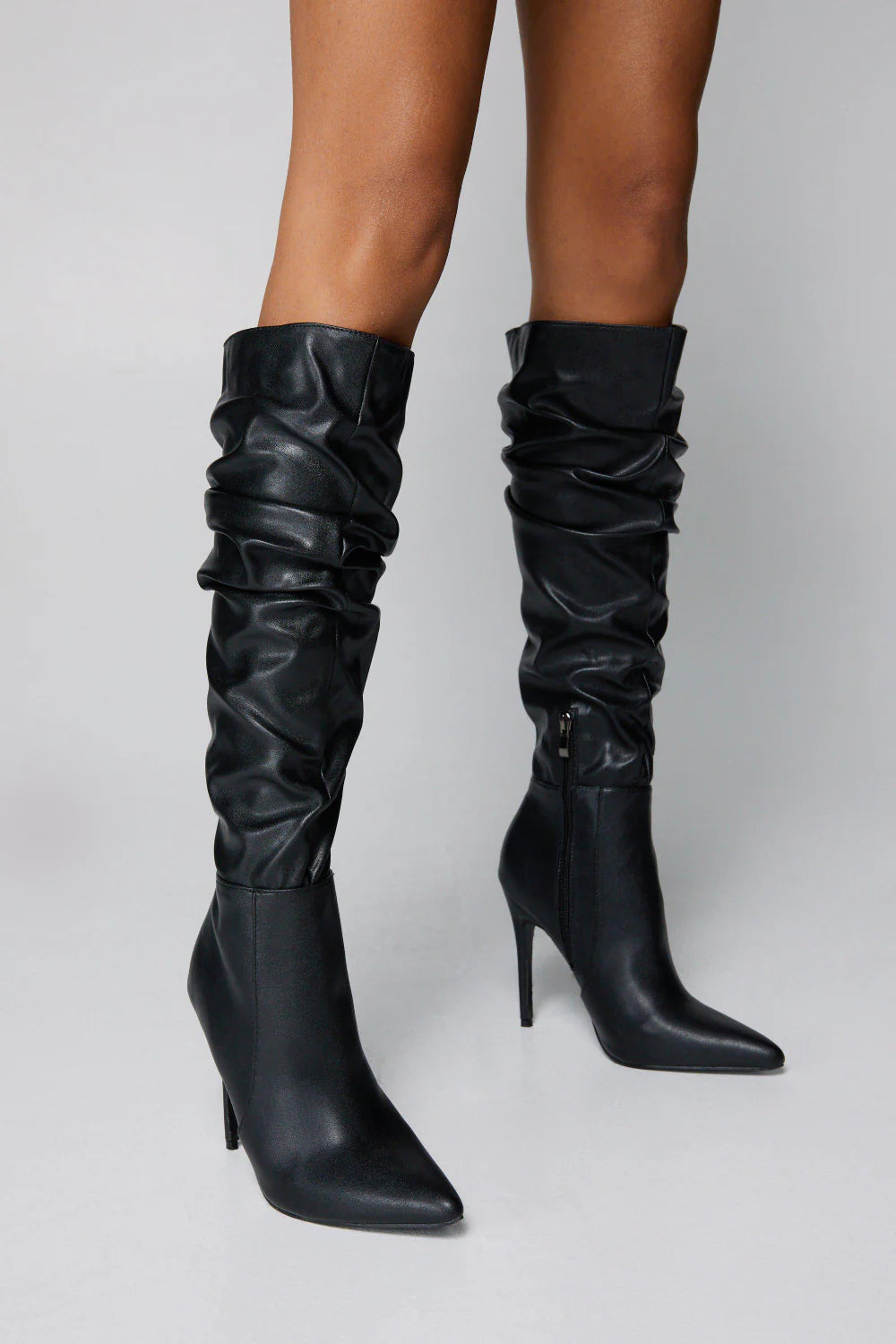 PU Ruched Stiletto Heel Pointed Toe Knee High Boots