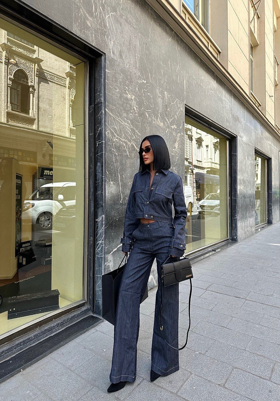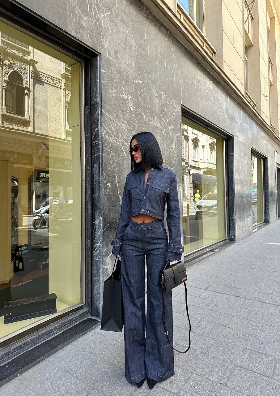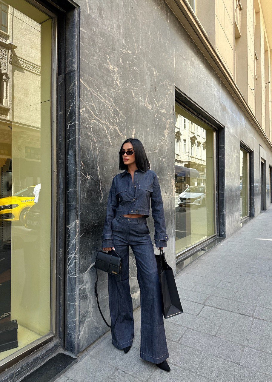 Cropped Denim Jacket and Wide Leg Trouser Set