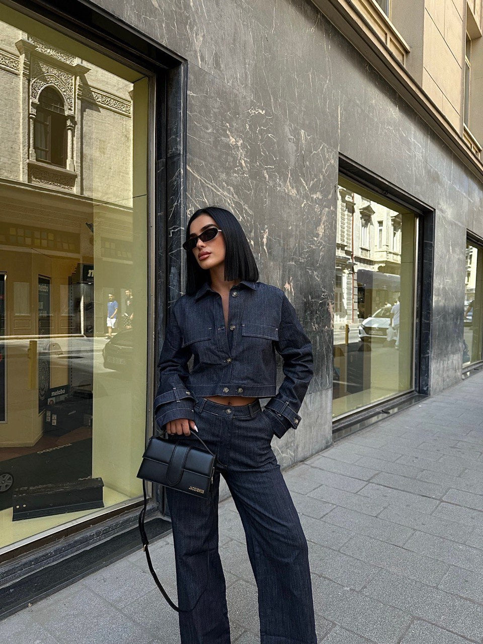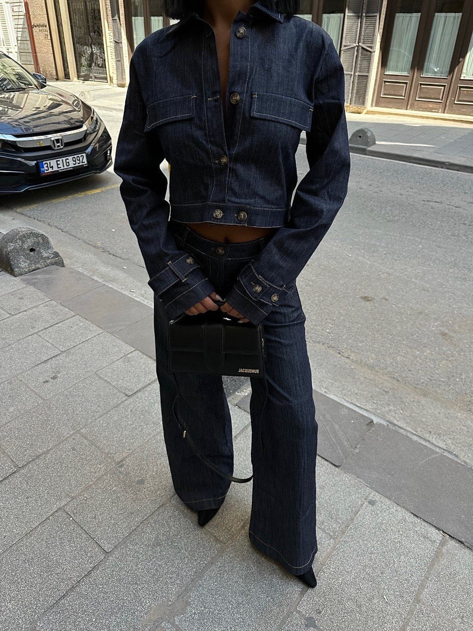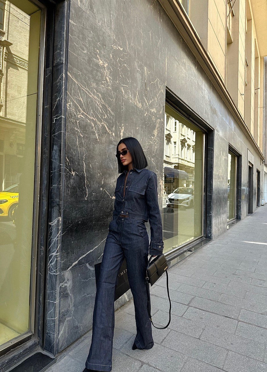 Cropped Denim Jacket and Wide Leg Trouser Set