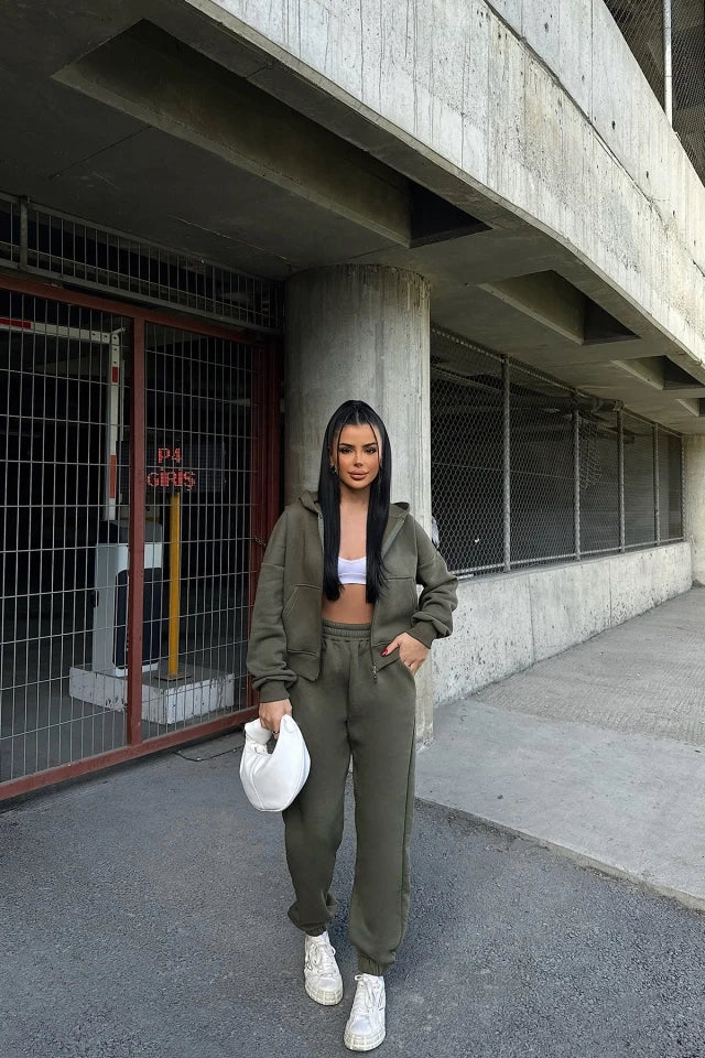Khaki Zipper Detailed Trousers Set