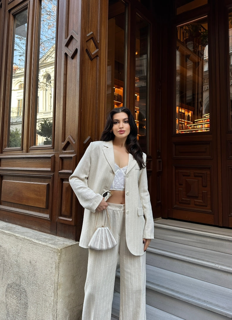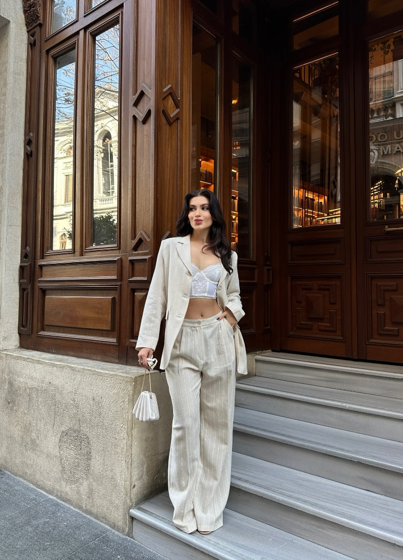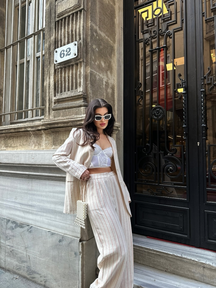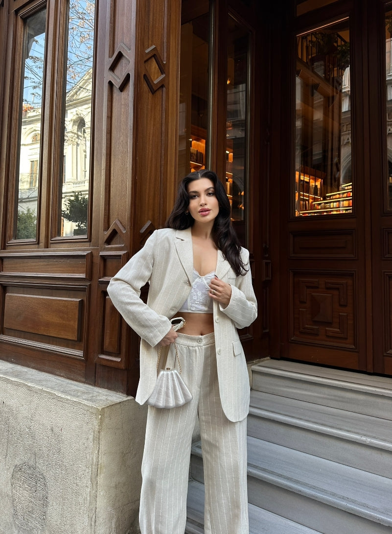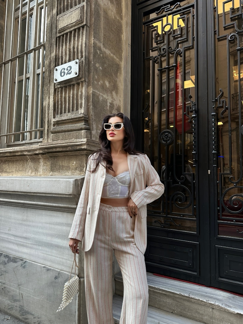 Inject some luxe vibes into your outfit of the day with this pinstripe blazer and trouser set. Its pinstripe material is so easy to style and adds that extra edge to your look. This blazer is sure to nail all the major trends this season. Team with a crop top, shorts, and clear heels for a weekend-worthy finish that everyone will want.