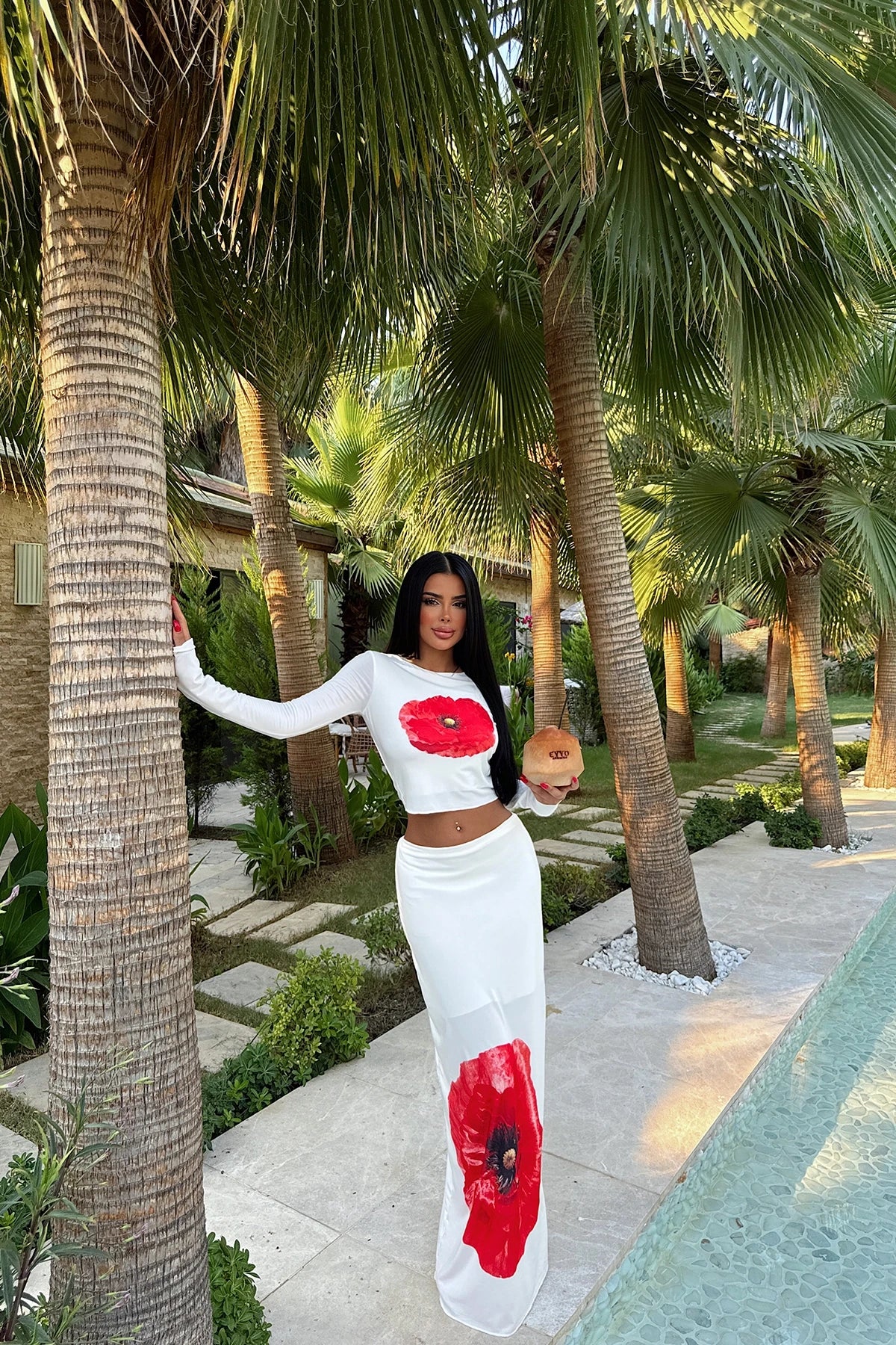 Rose Detail Long Sleeve Top and Maxi Skirt Set