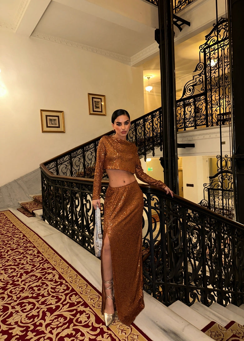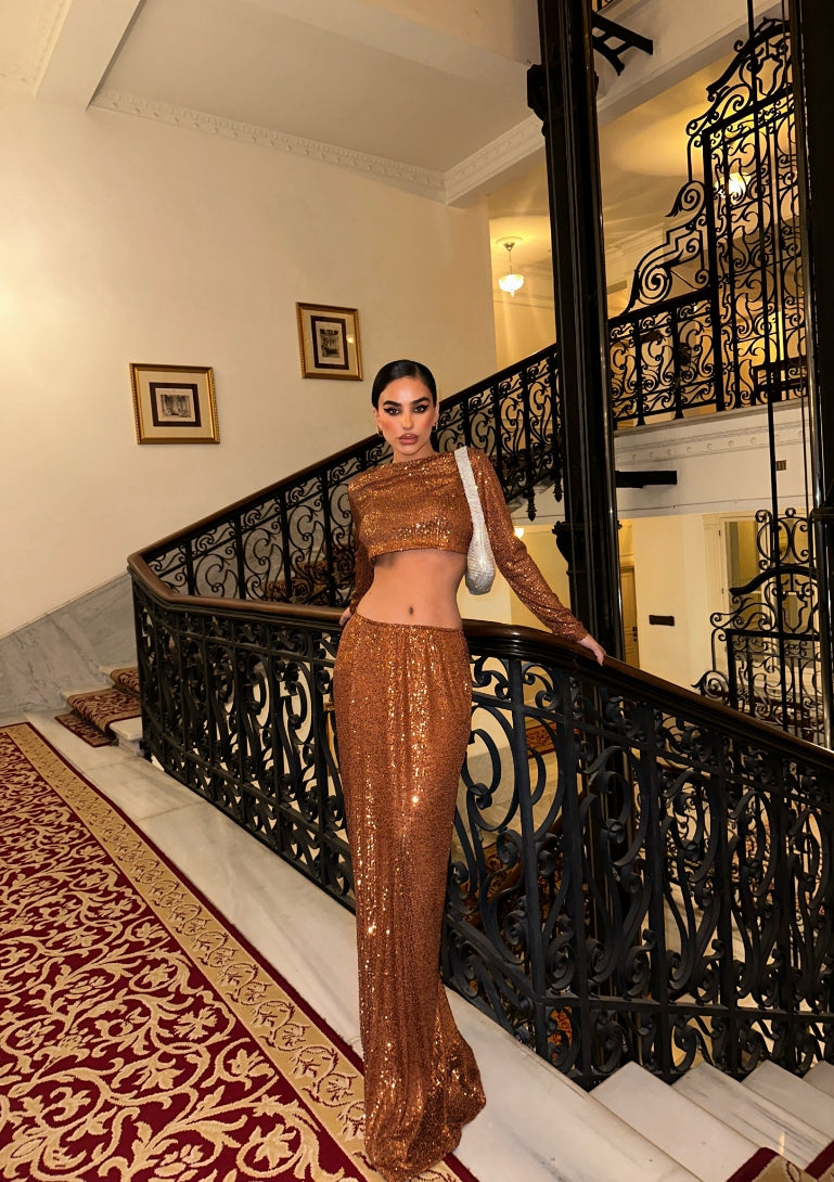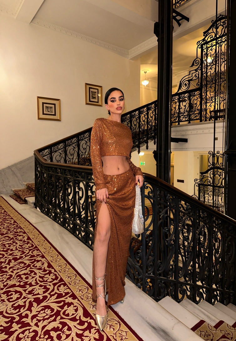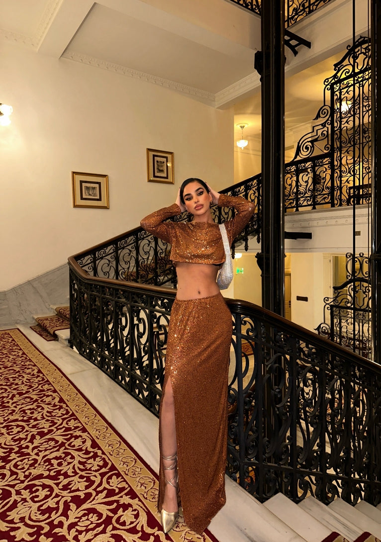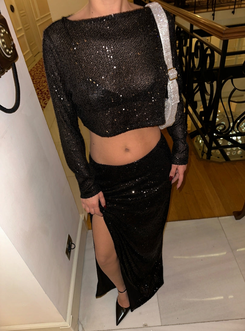 Channel all the luxe vibes into your weekend wardrobe with this sequin dress doll. Made from a glitter material with sequin detail, how could you say no? When the dress code calls for glam vibes, this shape top is the only answer. Team with the matching maxi skirt, clear heels and gold accessories for a look that won't go unnoticed.