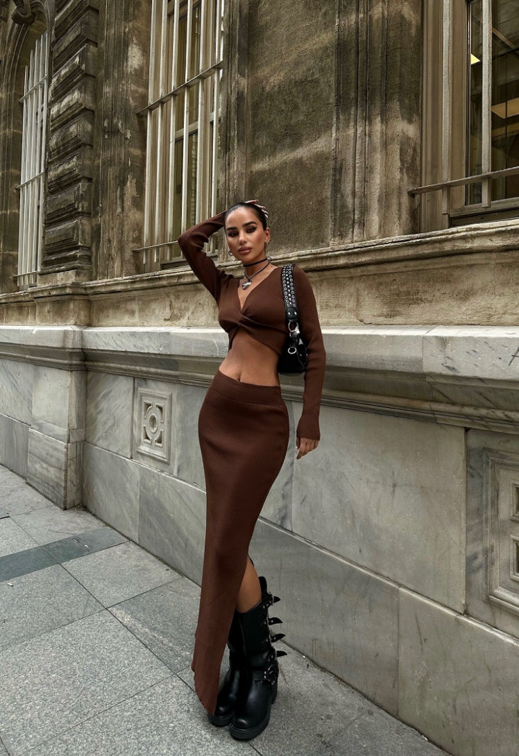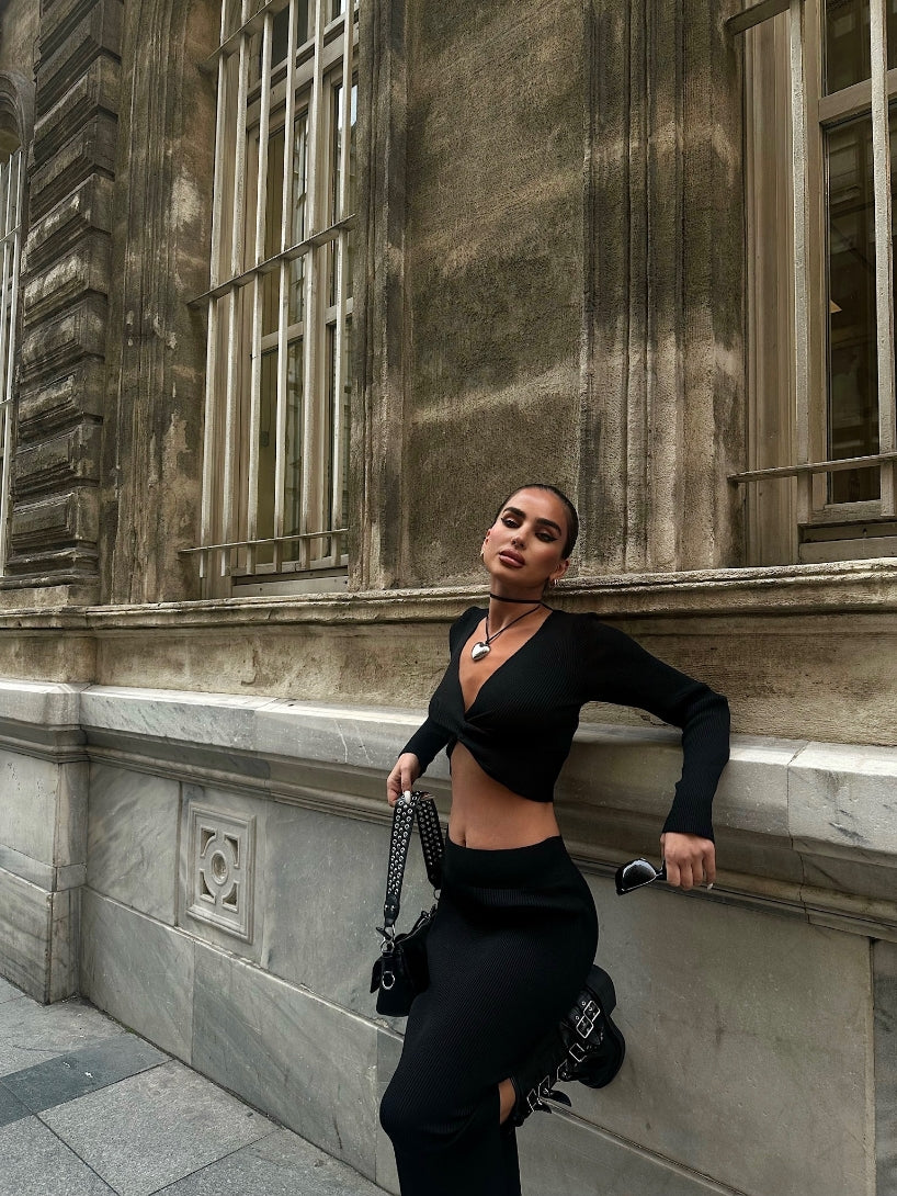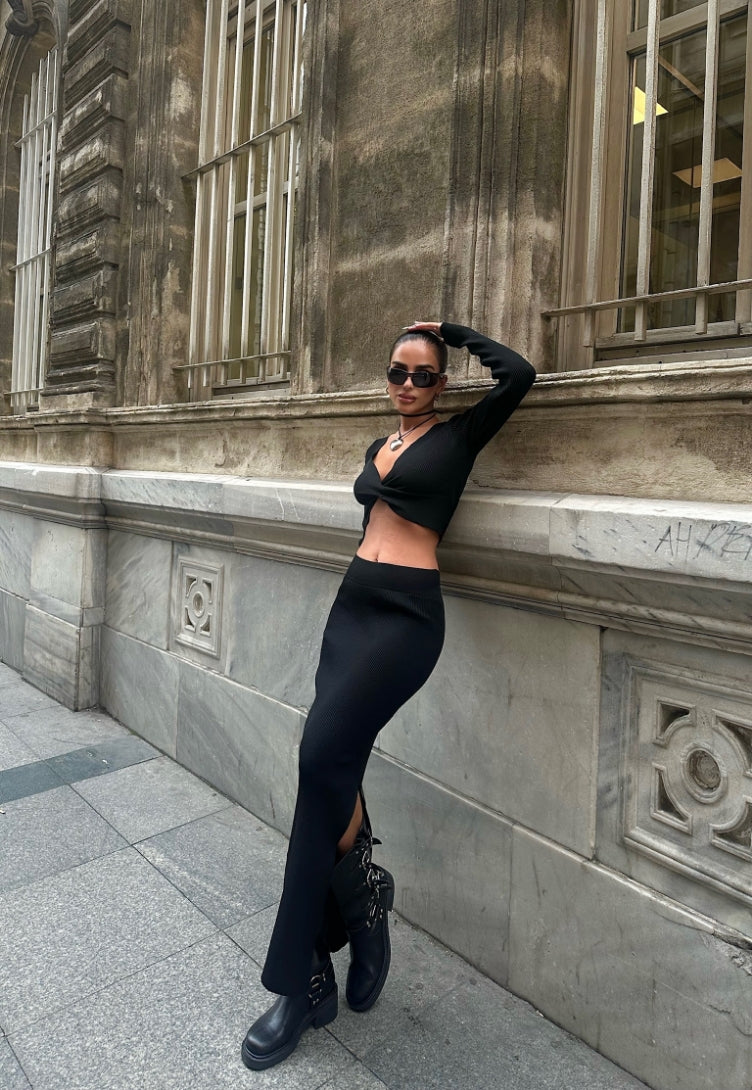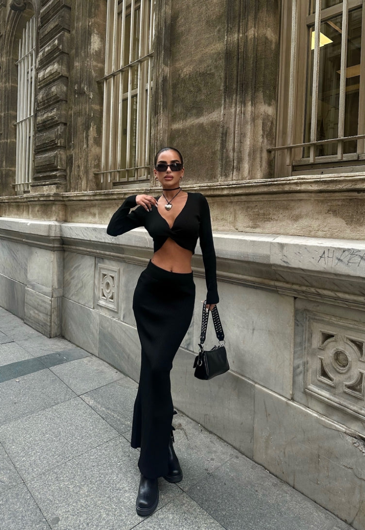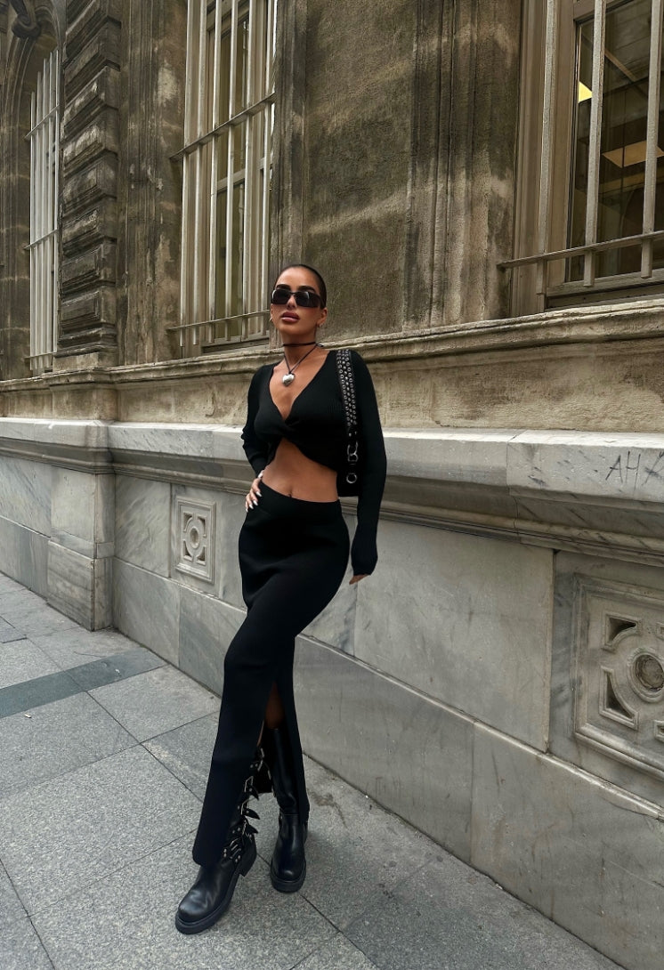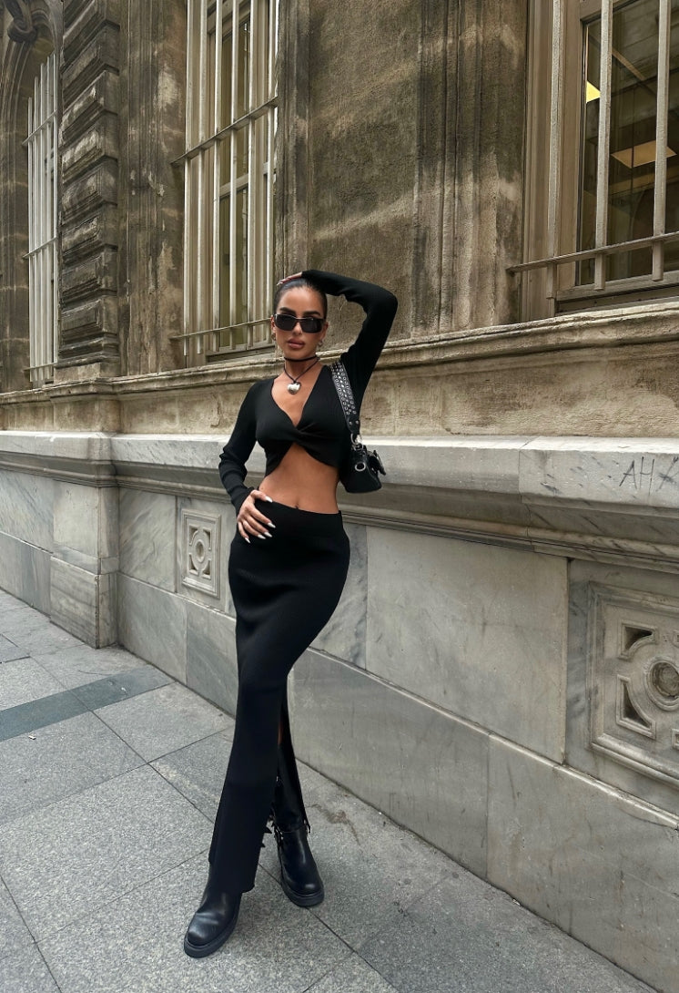 Cold weather shouldn't stop you from an unreal fit doll and this midaxi skirt is the perfect compromise. Featuring a black jersey material with a v-waist design. For the complete look just add the matching hue crop top and heeled boots.