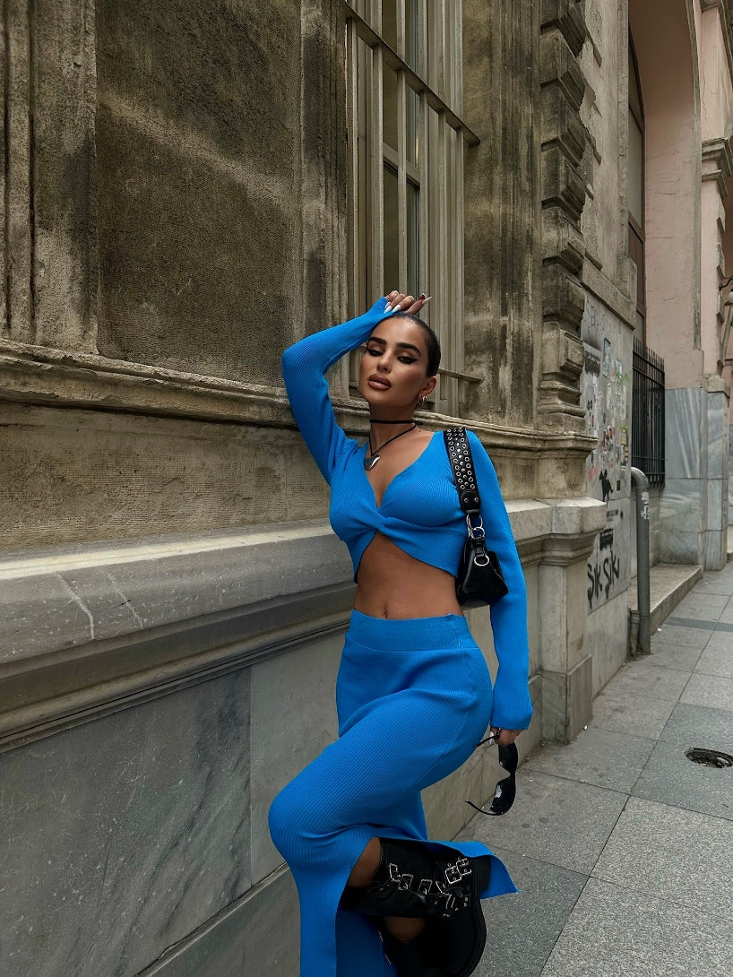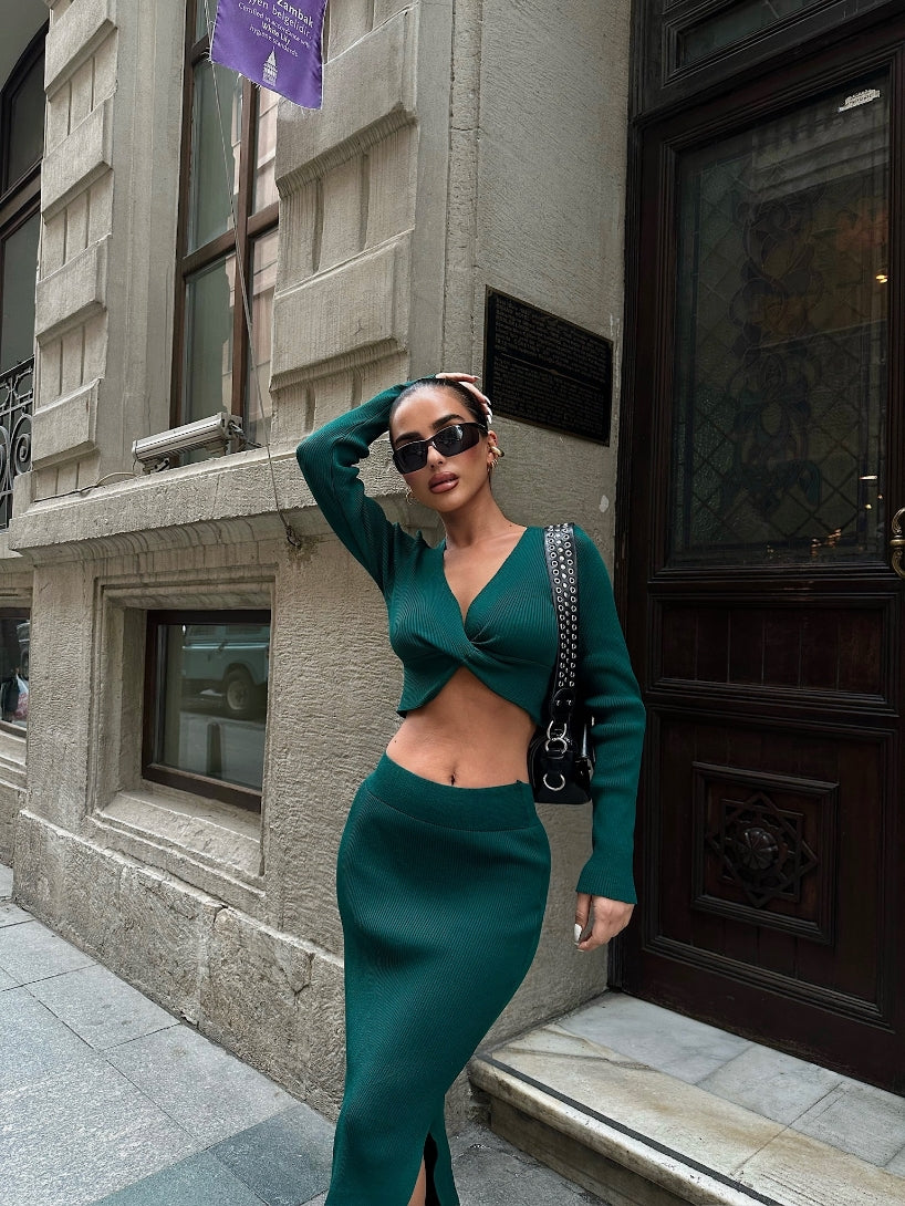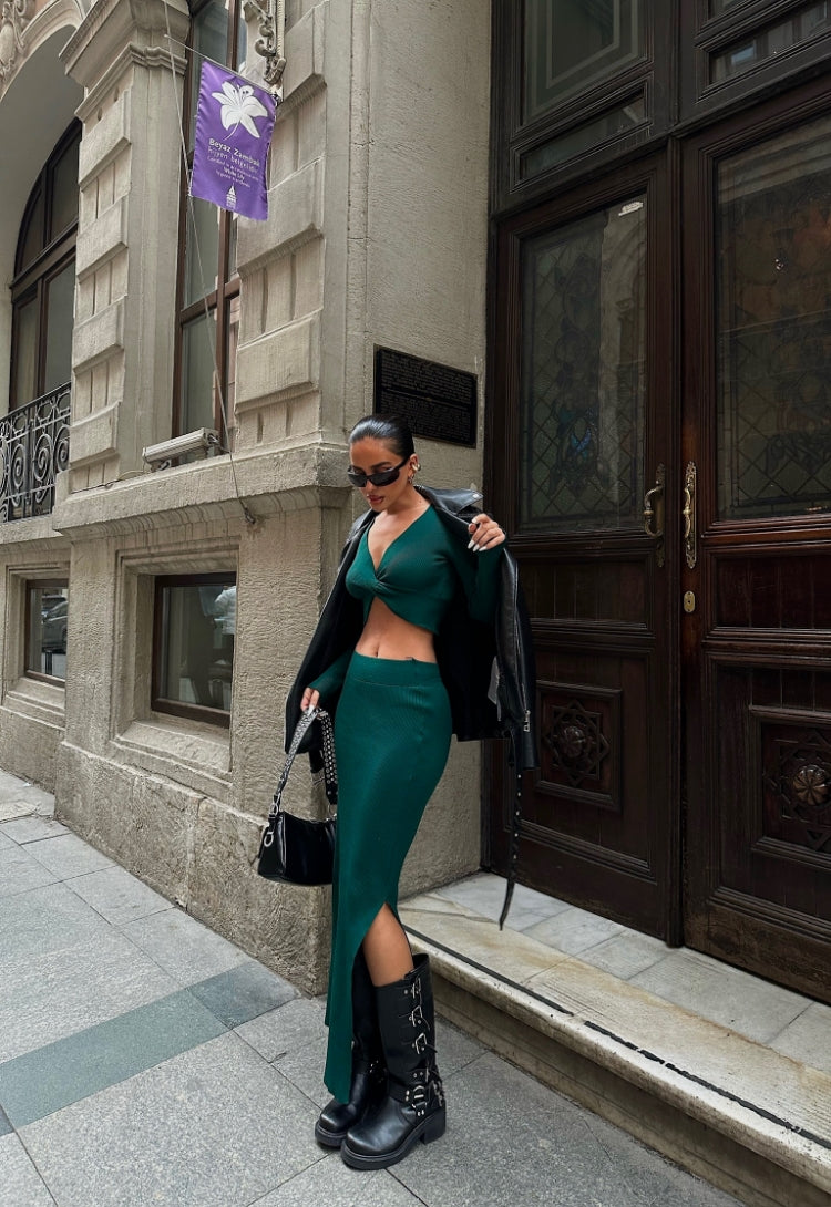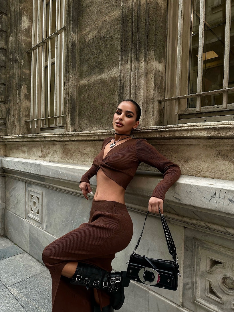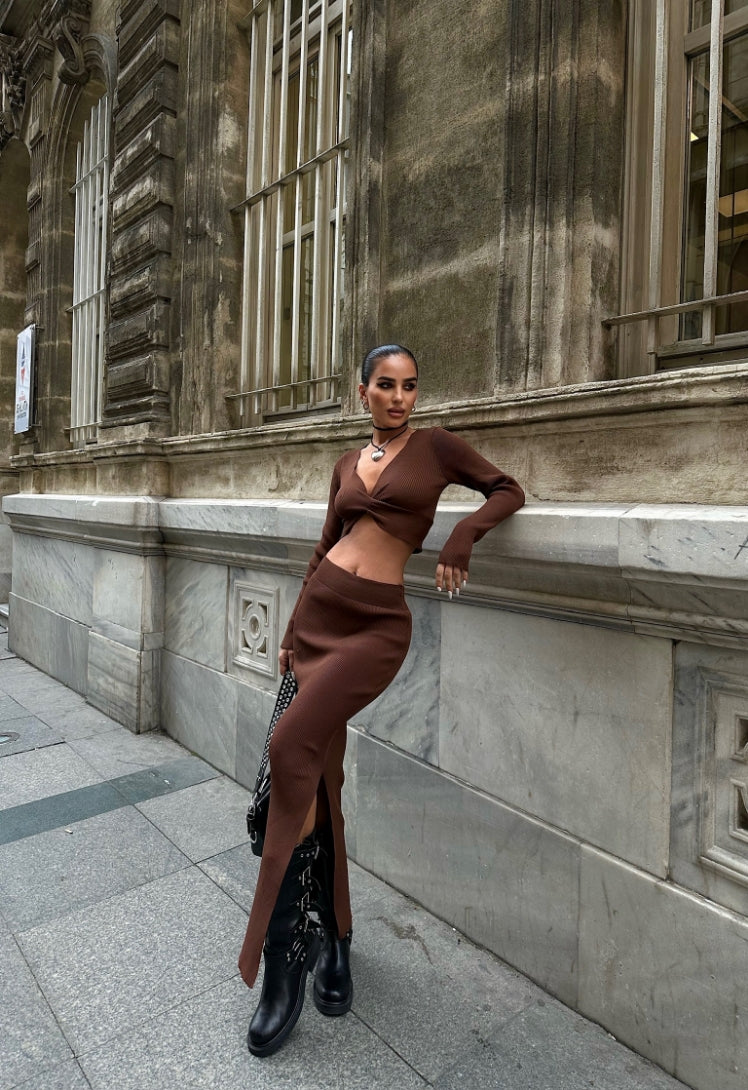 Cold weather shouldn't stop you from an unreal fit doll and this midaxi skirt is the perfect compromise. Featuring a black jersey material with a v-waist design. For the complete look just add the matching hue crop top and heeled boots.