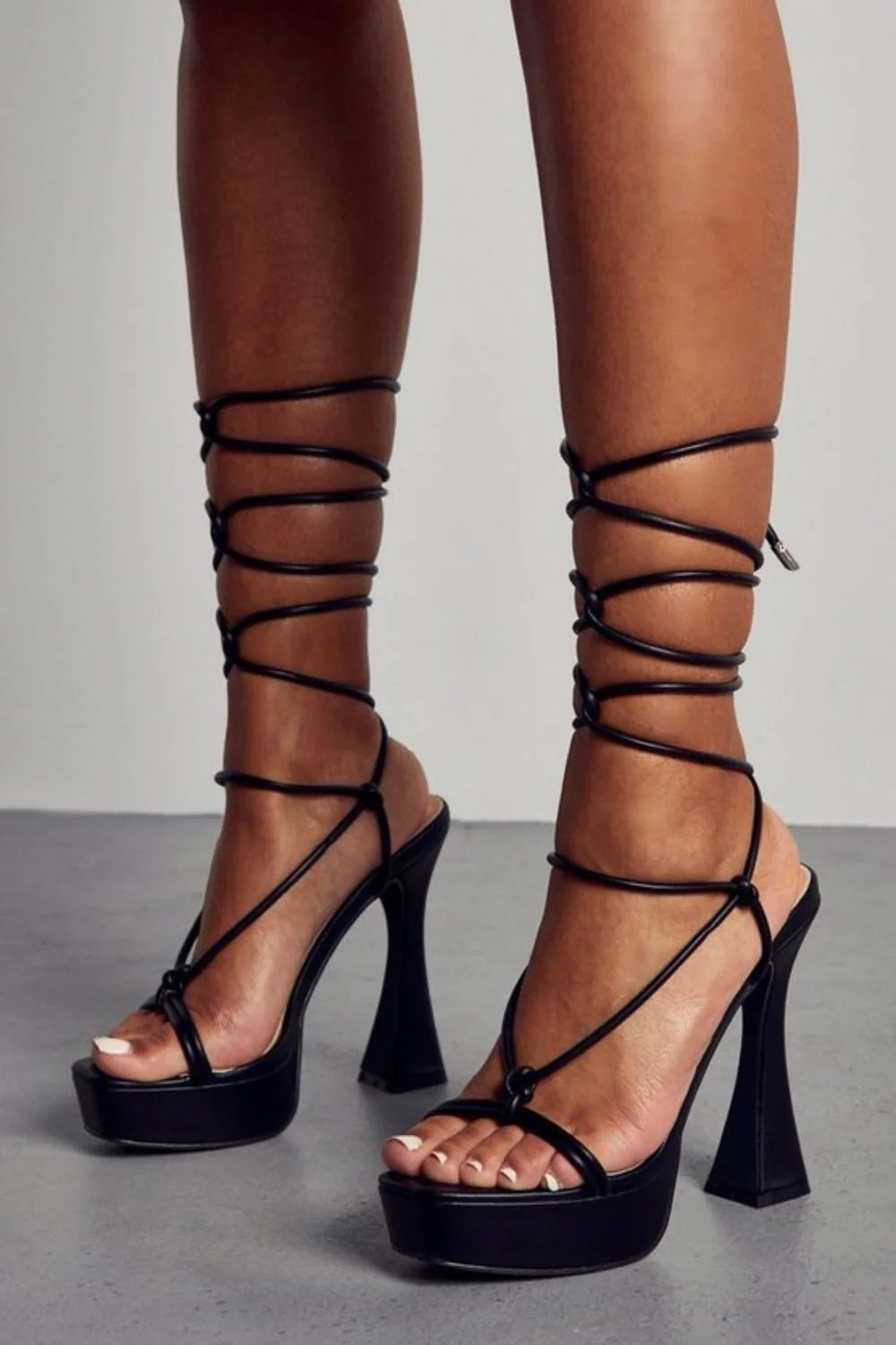 Women's flared platform feel featuring lace-up detail and knotted front mule