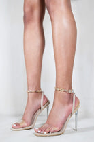 Women's strappy stiletto high heel. Featuring a high heel with perspex front strap and chain ankle strap in a black patent finish.