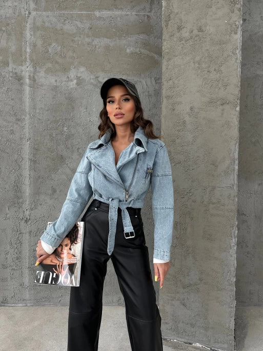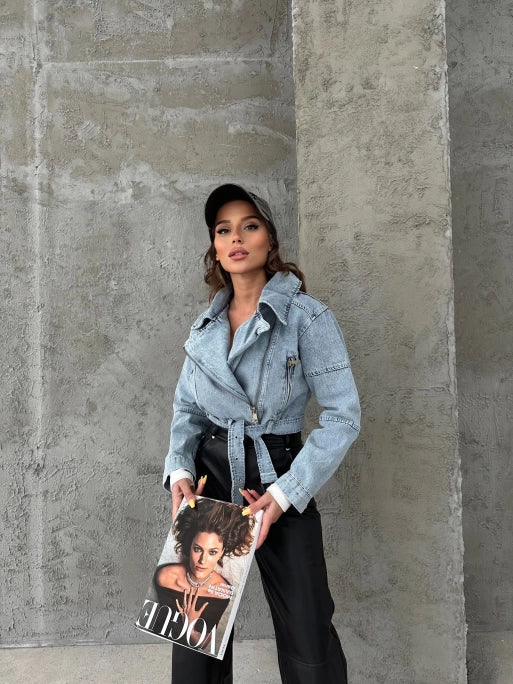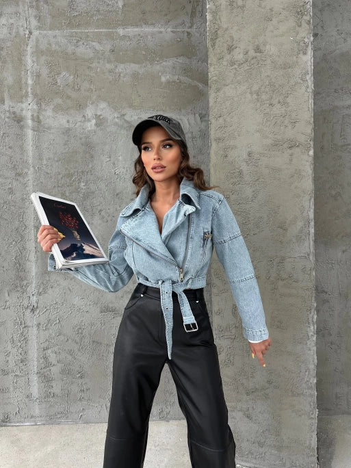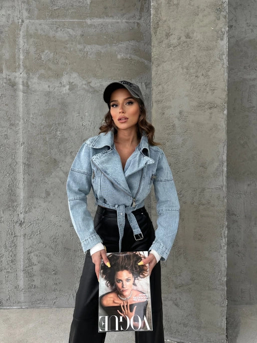 We are all about this belt biker denim jean jacket right now so make sure your new season look stays on trend in this denim jacket. Brought to you in a mid blue wash denim material with a zip through design and a cropped fit, how can you resist? Style this denim jacket with a PU leather trousers, heels and gold accessories for a look that is sure to have all eyes on you.
