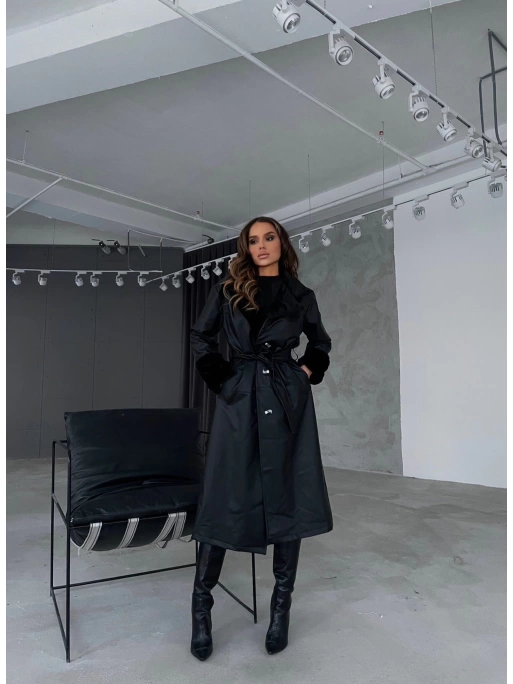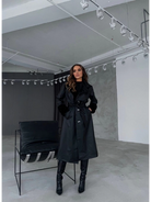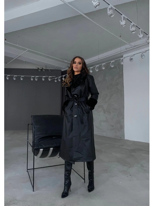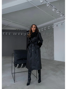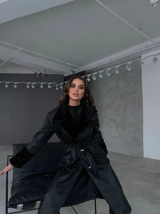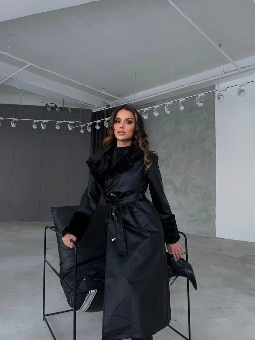 Leather Trench Coat With Collar and Sleeve Plush Details