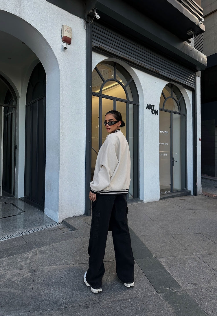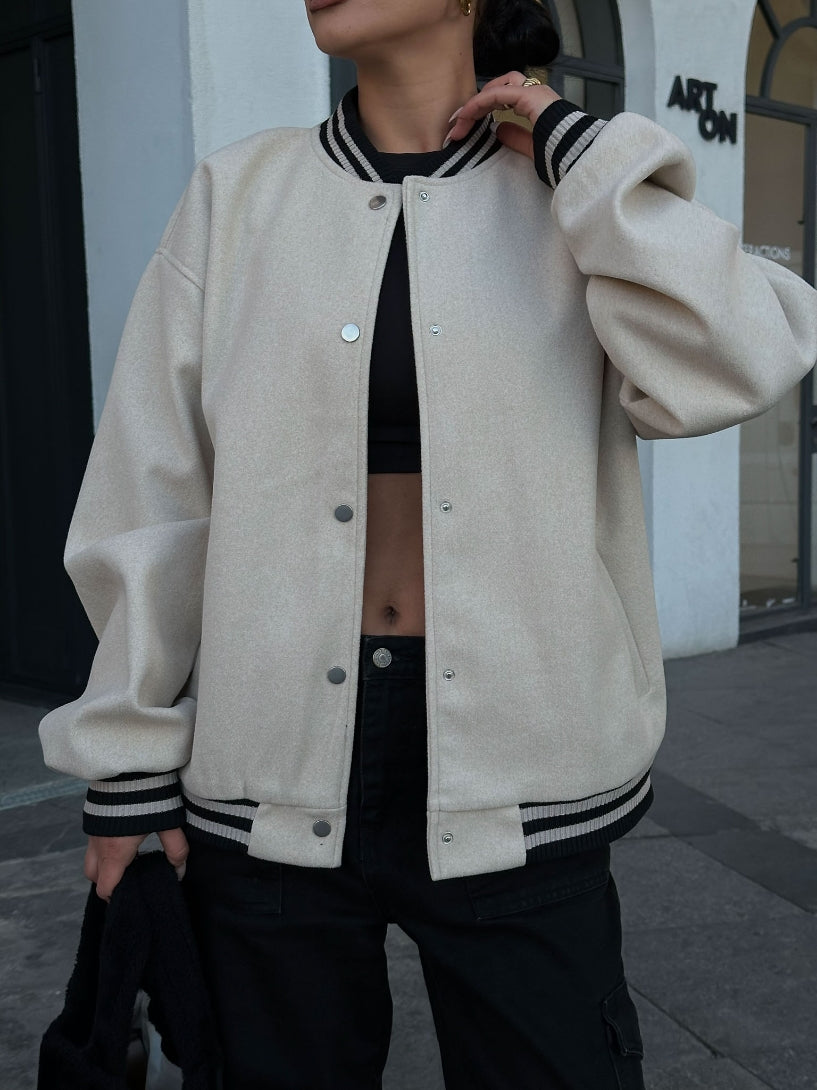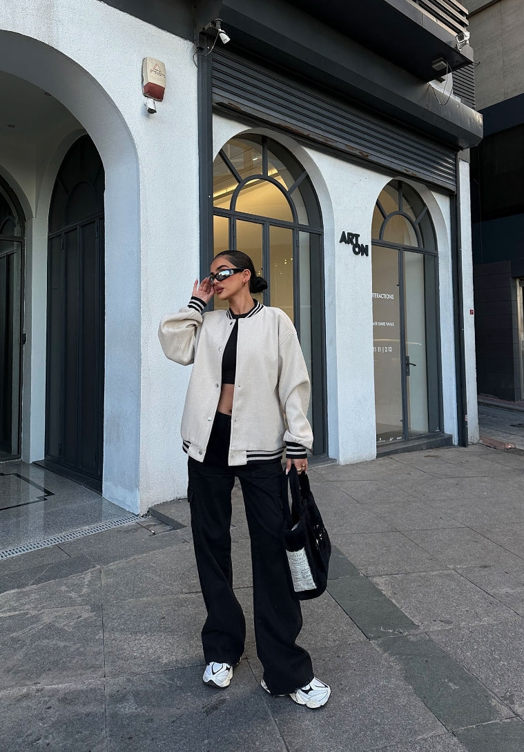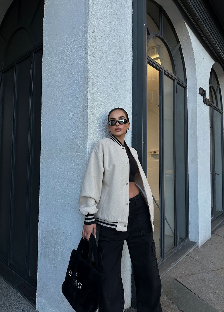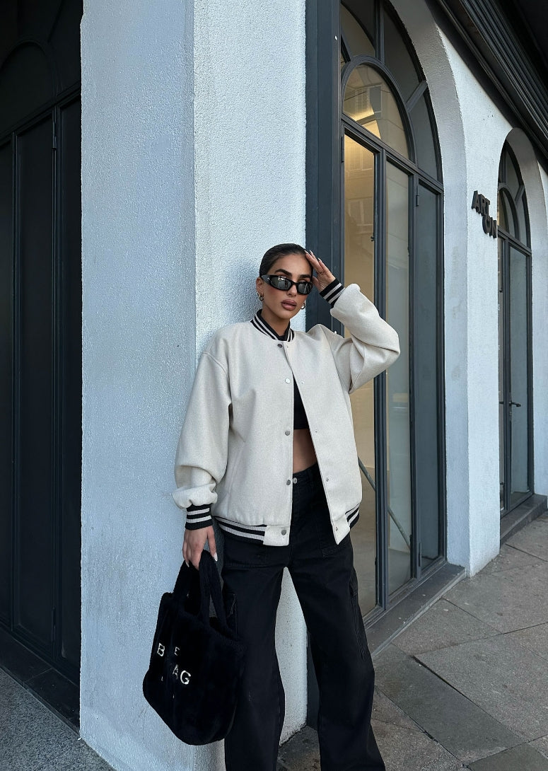 Nail new season trends with this bomber jacket. Featuring a stone hue material and a varsity style, we're obsessed. Wear with a crop top, cargo bottoms and kicks for a fierce off-duty 'fit.