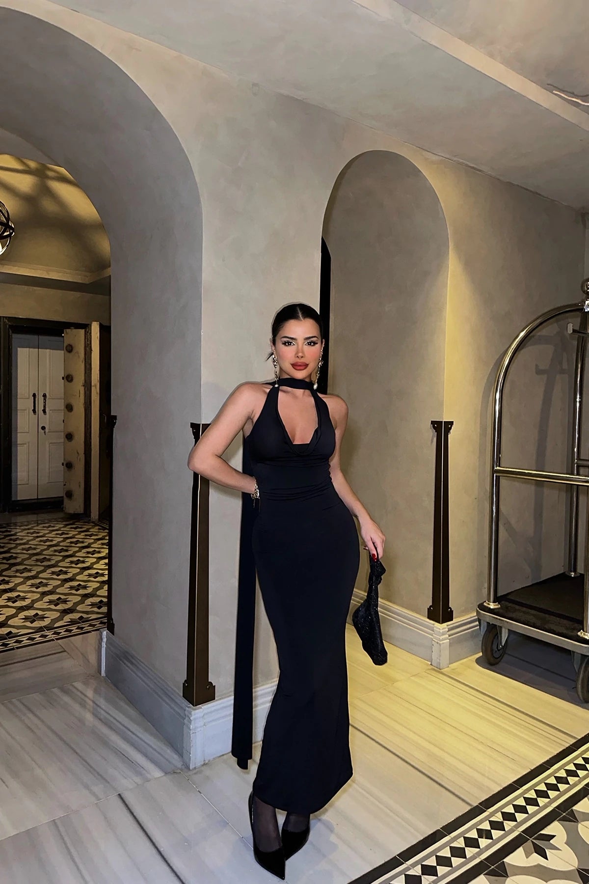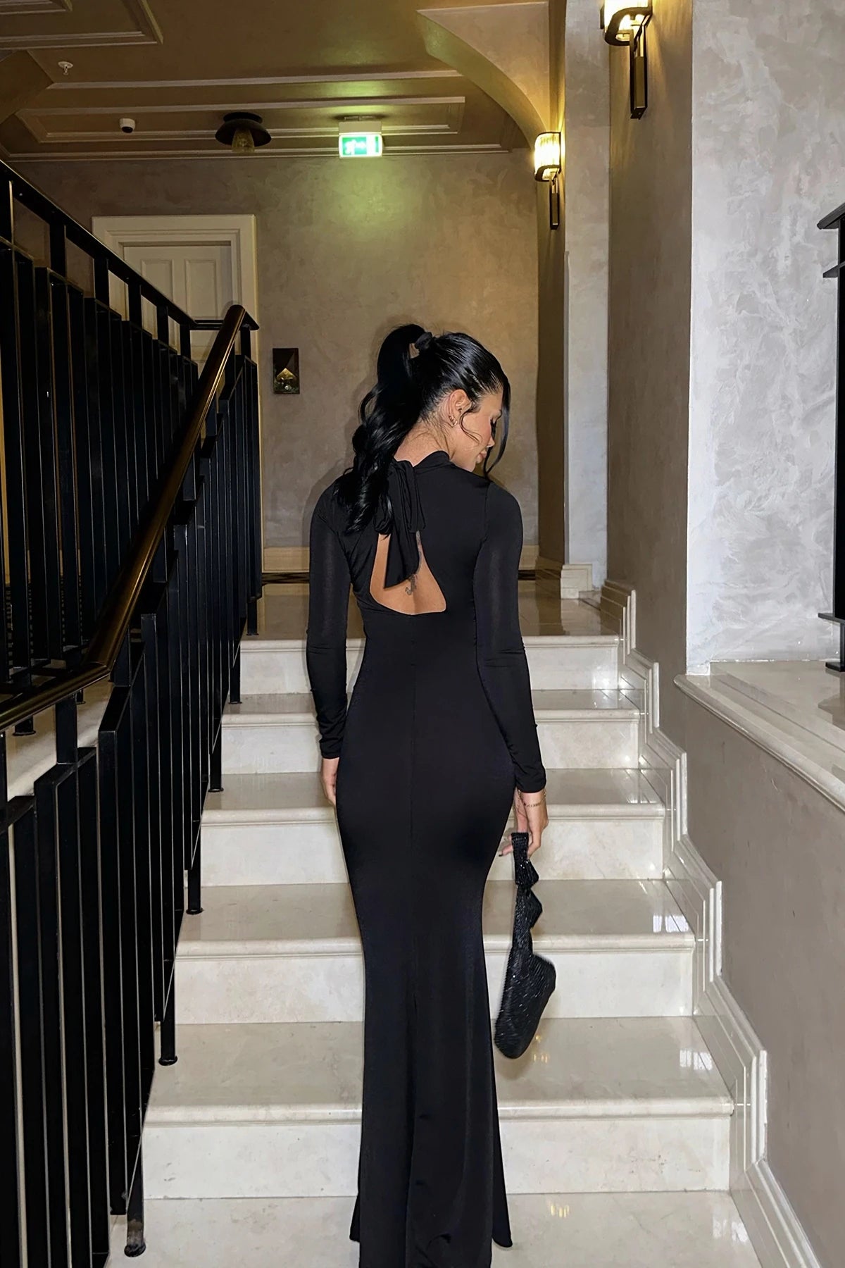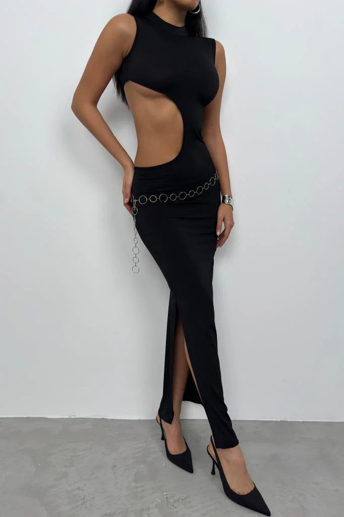 Black High-Neck Open Back Detail Long Dress