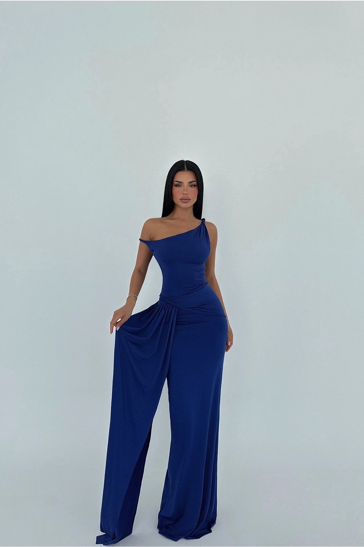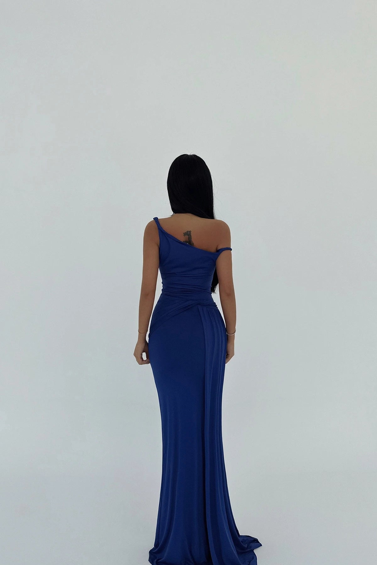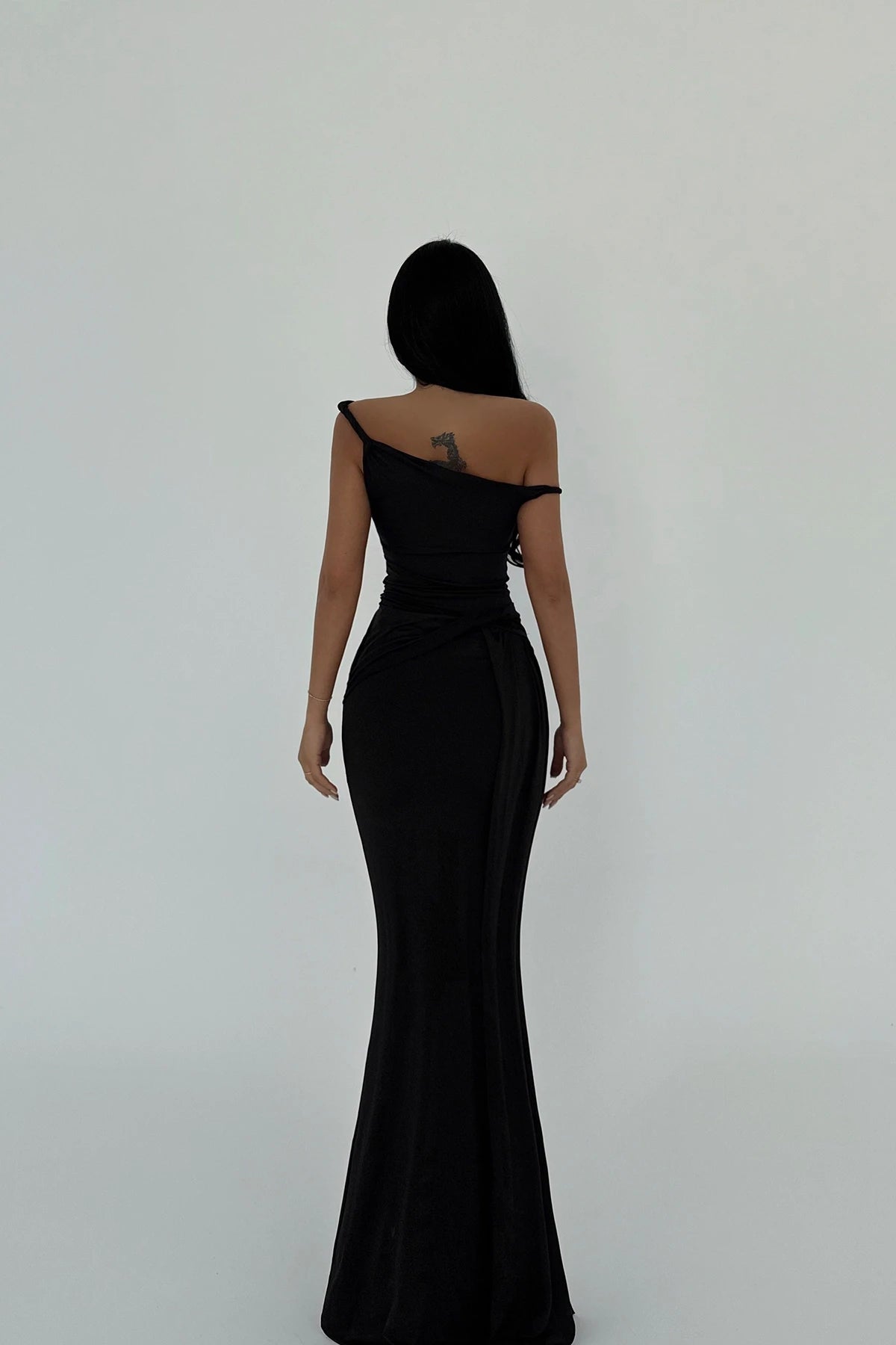 This maxi dress, is the after-dark essential your wardrobe is currently lacking. Its defining characteristic is the asymmetric neckline, a detail that commands attention with understated confidence. The fabric drapes beautifully, skimming the figure to create a streamlined silhouette. Consider styling it with a delicate chain necklace from our jewellery collection to further accentuate the neckline and complete the look.