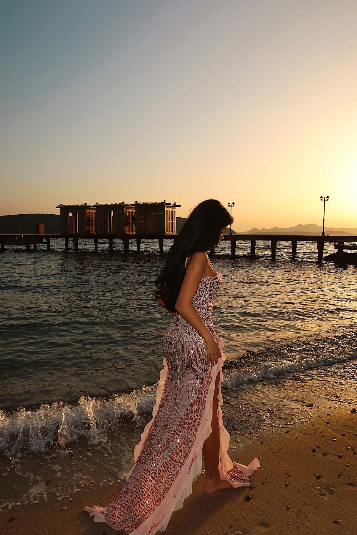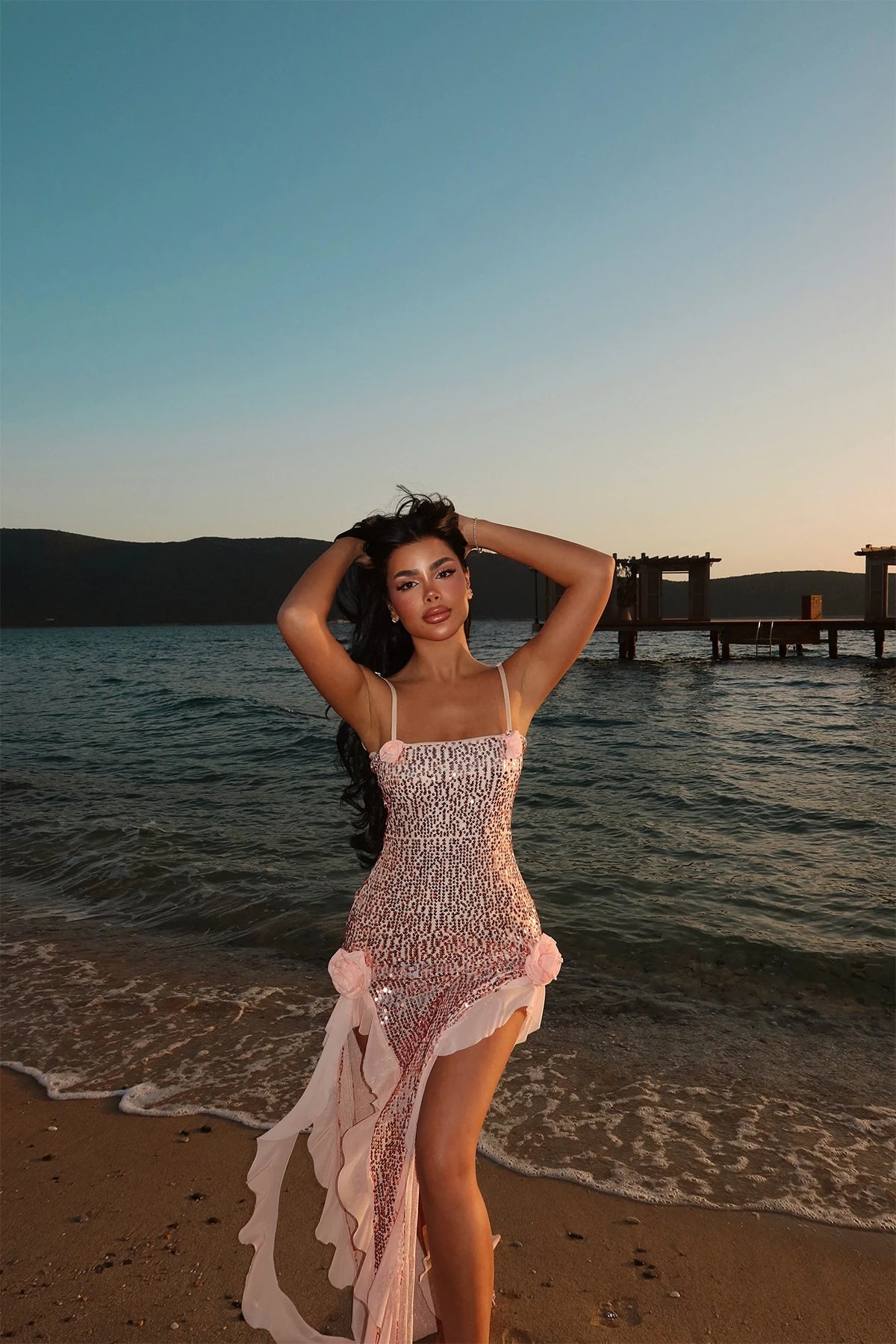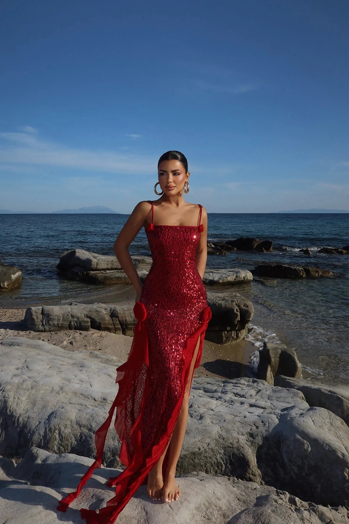 Get ready to shine in this sequin slit maxi dress. Brought to you in sequin material, this dress has sequin embellishments throughout and a sleek fitted maxi design. Pair it with your favourite stiletto heels and understated jewellery to let the dress do the talking.