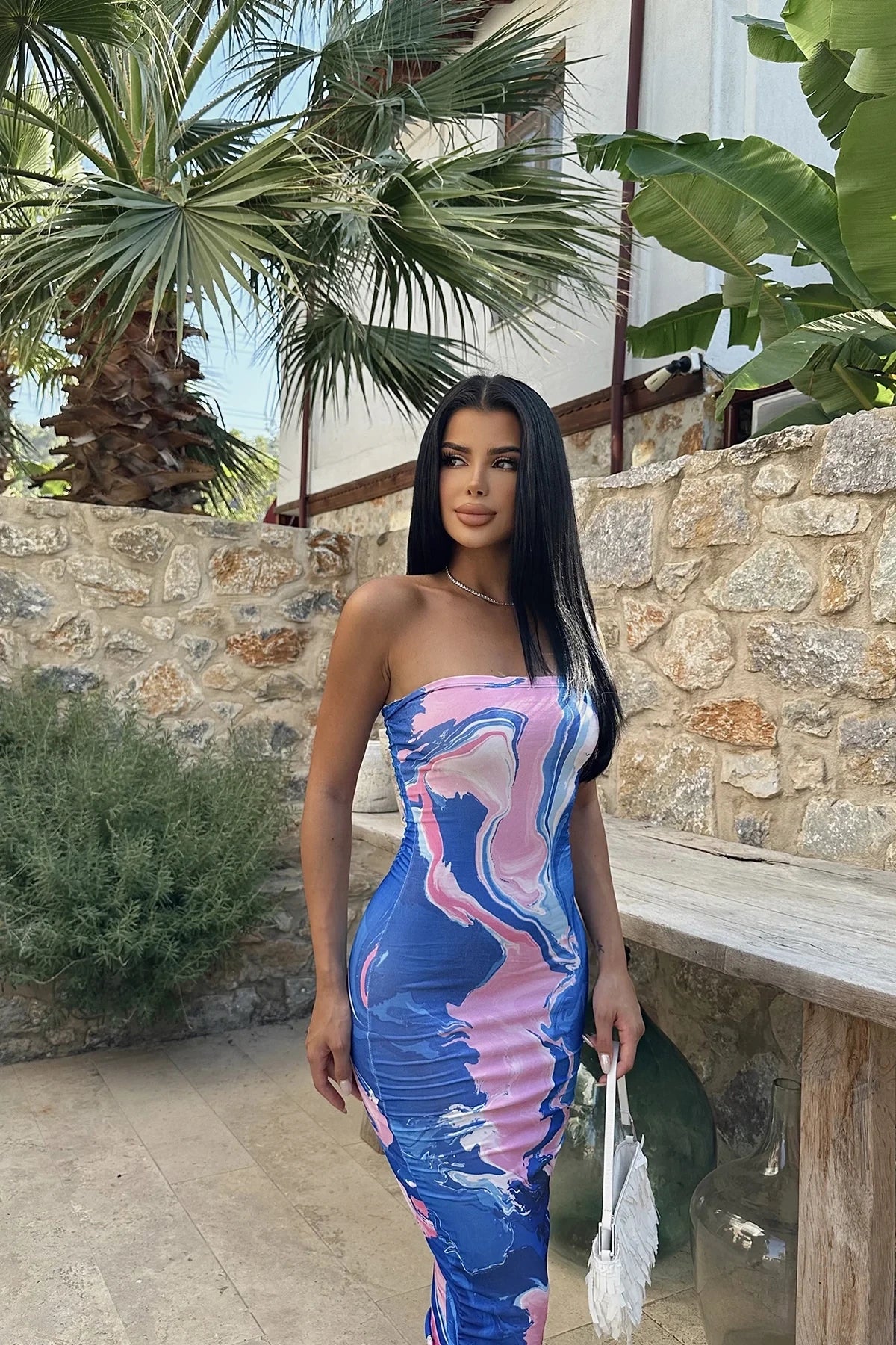We are obsessing over this dress which is essential for your weekend wardrobe. Featuring a mixed colour material with an abstract print, a flattering bandeau neckline and ruched detailing. Style with tie-up heels, clutch bag and gold accessories to complete the look.