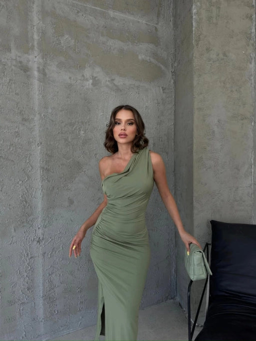 Have heads turning for all the right reasons in this next level dress. Featuring a one shoulder design and a midi length. This statement piece does all the talking, just add slip-on heels and hoop earrings.