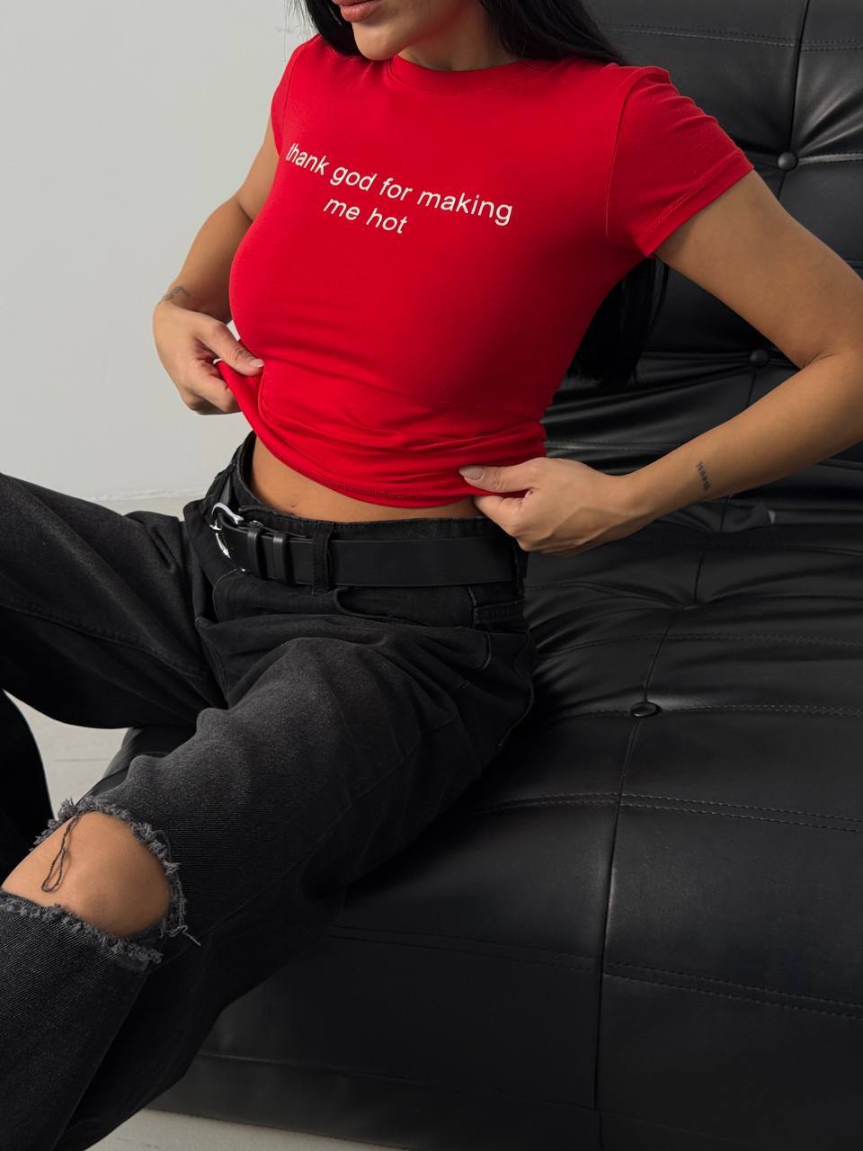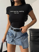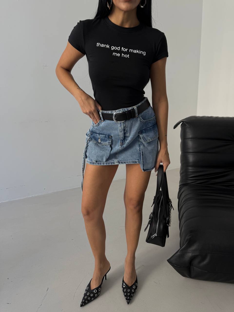Elevate your everyday edit with this “Thank God for making me hot” top, crafted from a seamless stretch knit. The short sleeves and considered length lend themselves to effortless layering or provide a sleek foundation for bolder styling choices. Babe pair this top with tailored trousers for a modern, monochromatic statement, or opt for wide-leg jeans to embrace a more relaxed silhouette.
