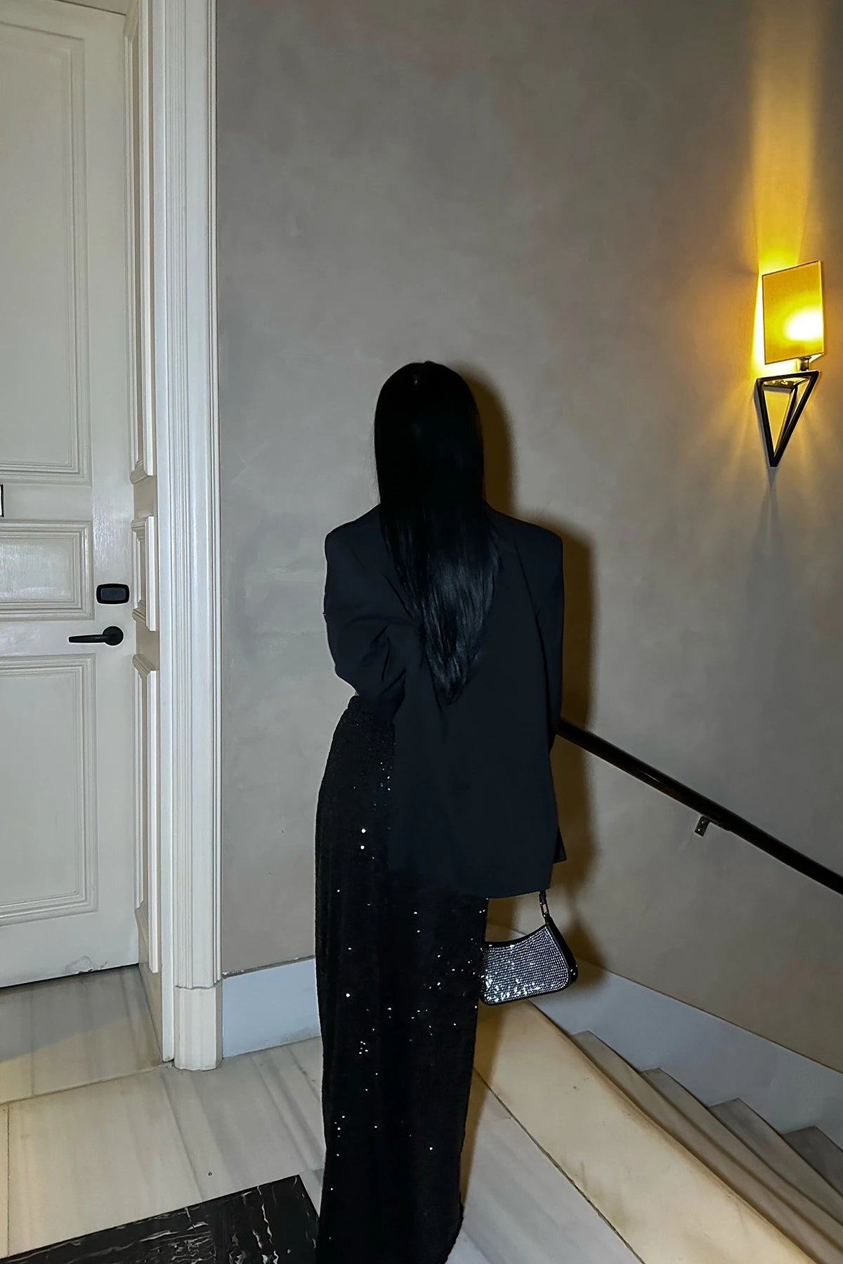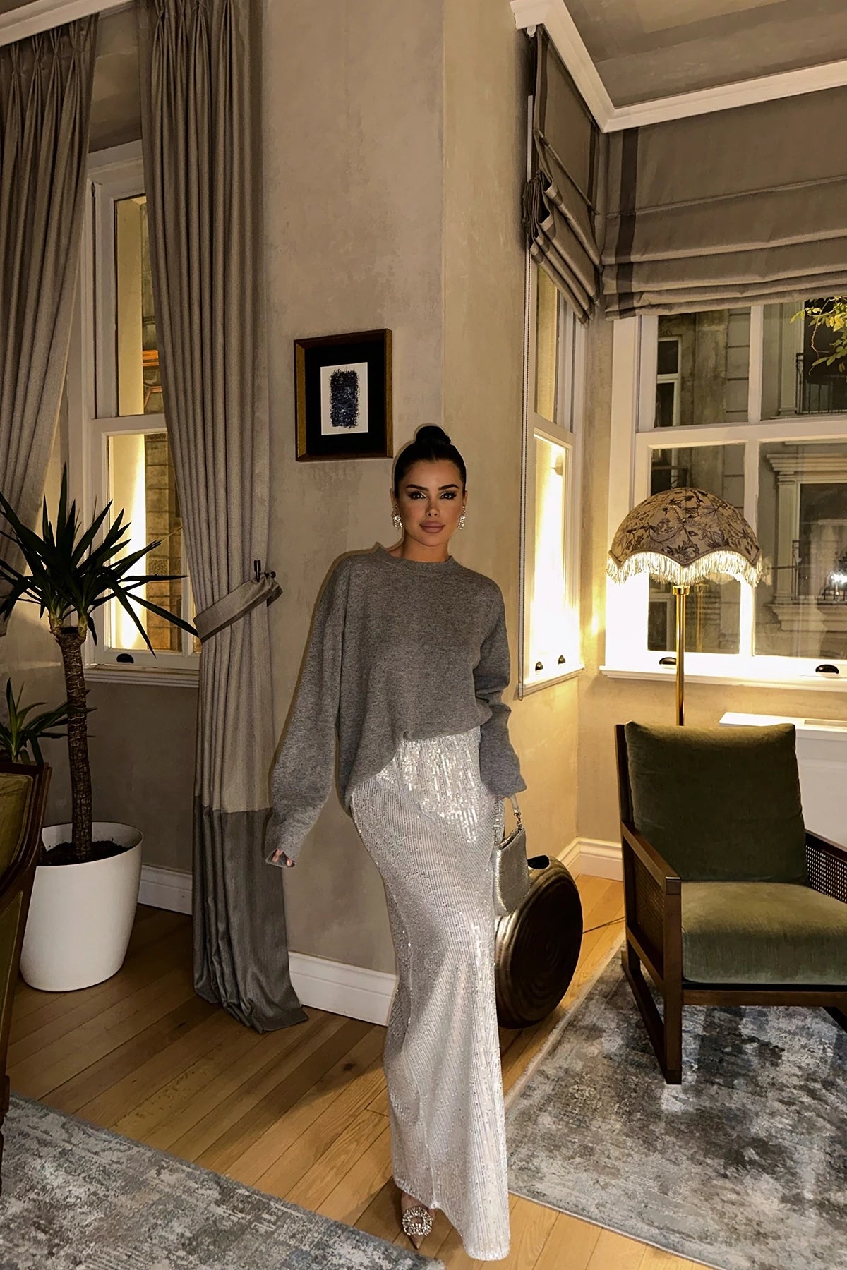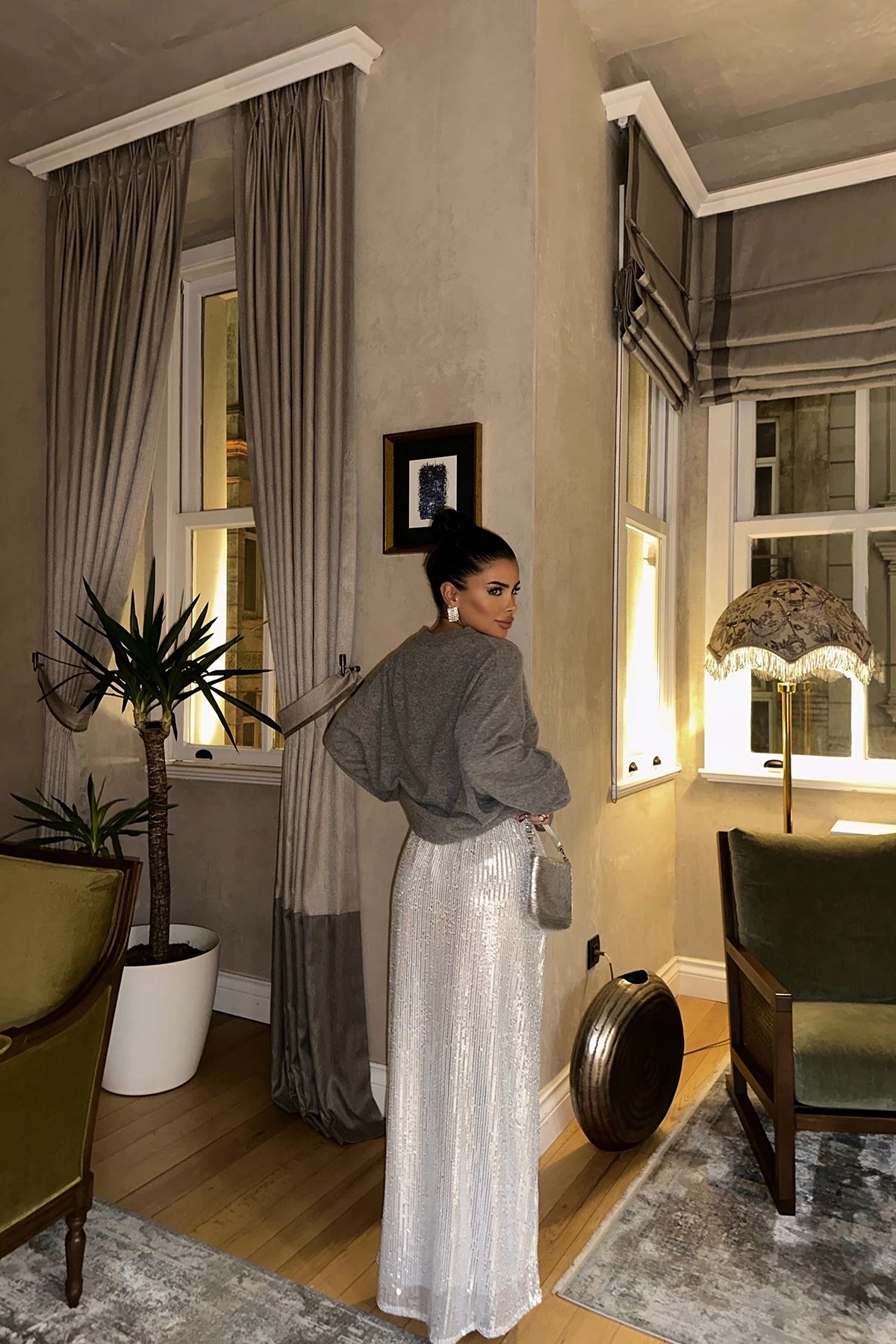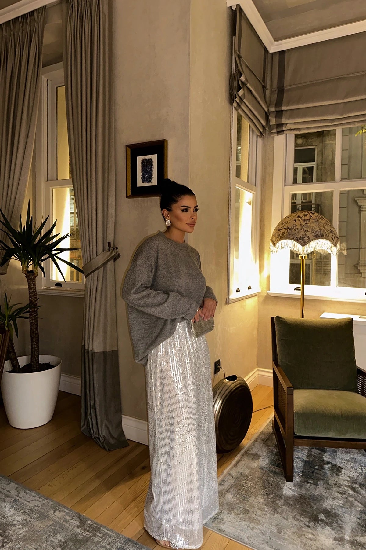 Get your glam on with this white sequin split back detail midaxi skirt, you’re sure to have all eyes on you. When the weekend calls so does this midaxi skirt. So what are you waiting for? Shop the look and opt for the matching bralet and a pair of clear heels. It’s a yes from us.