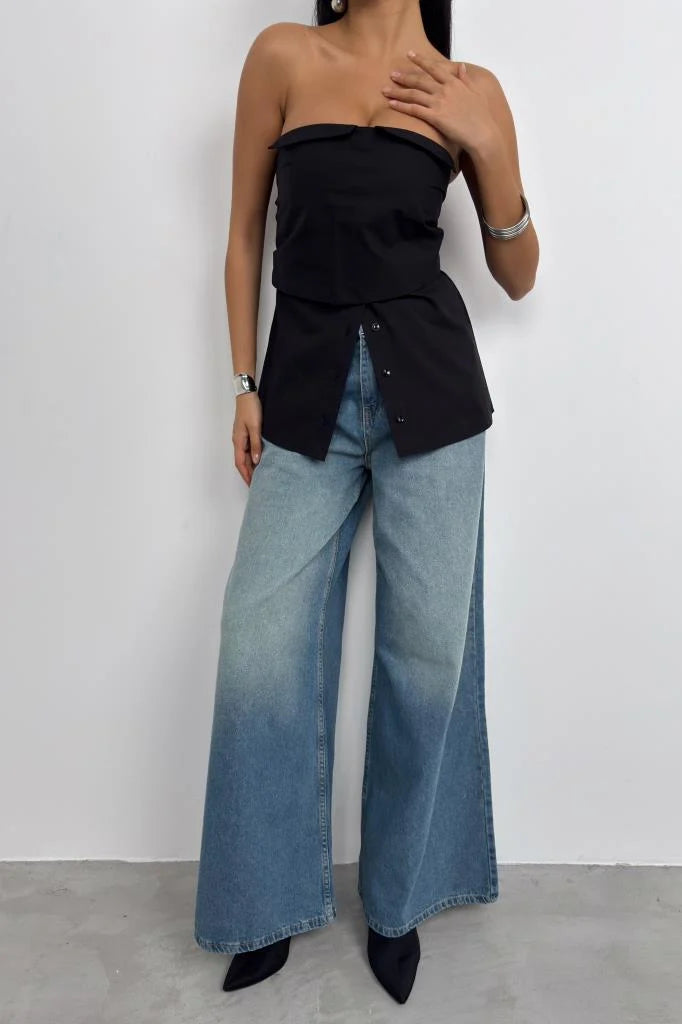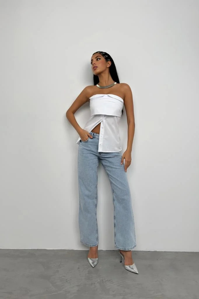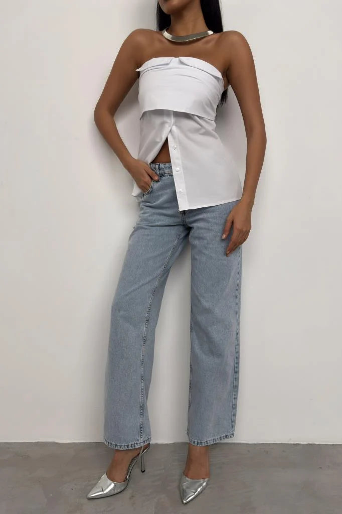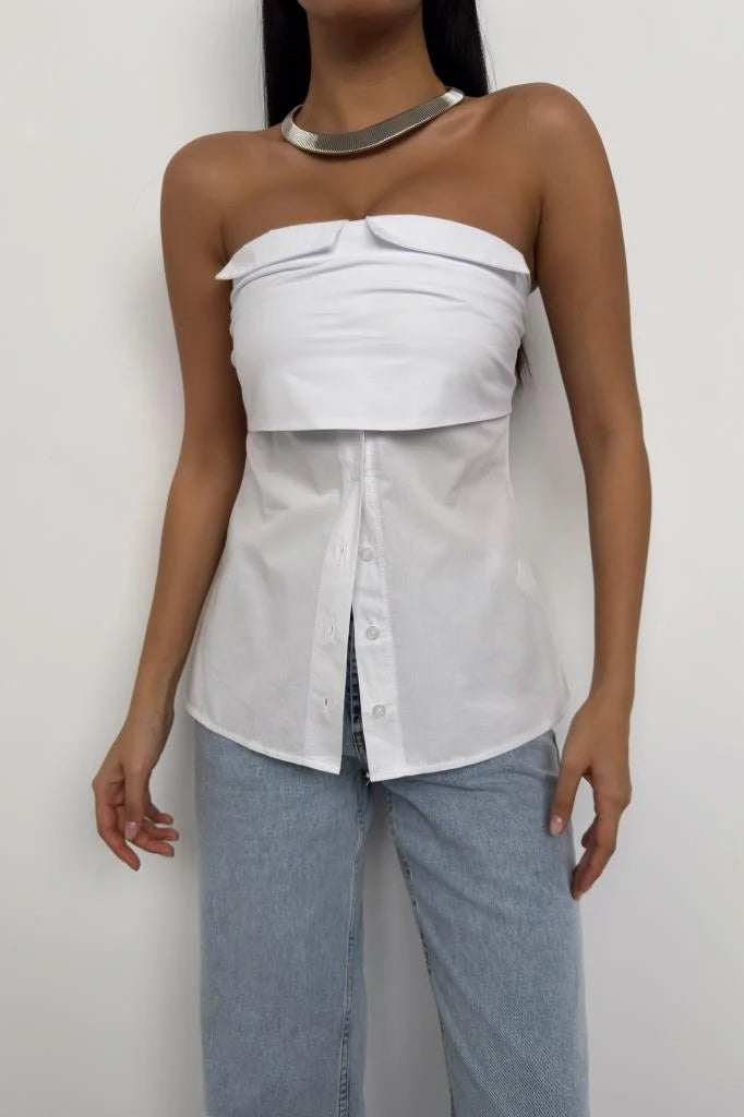 Level up your new season look with this button detail strapless vlouse. Perfect for AM to PM styling doll, what more could you want? Style this top with the matching wide leg bottoms, sandals and gold accessories for an effortlessly chic look we just can't get enough of.