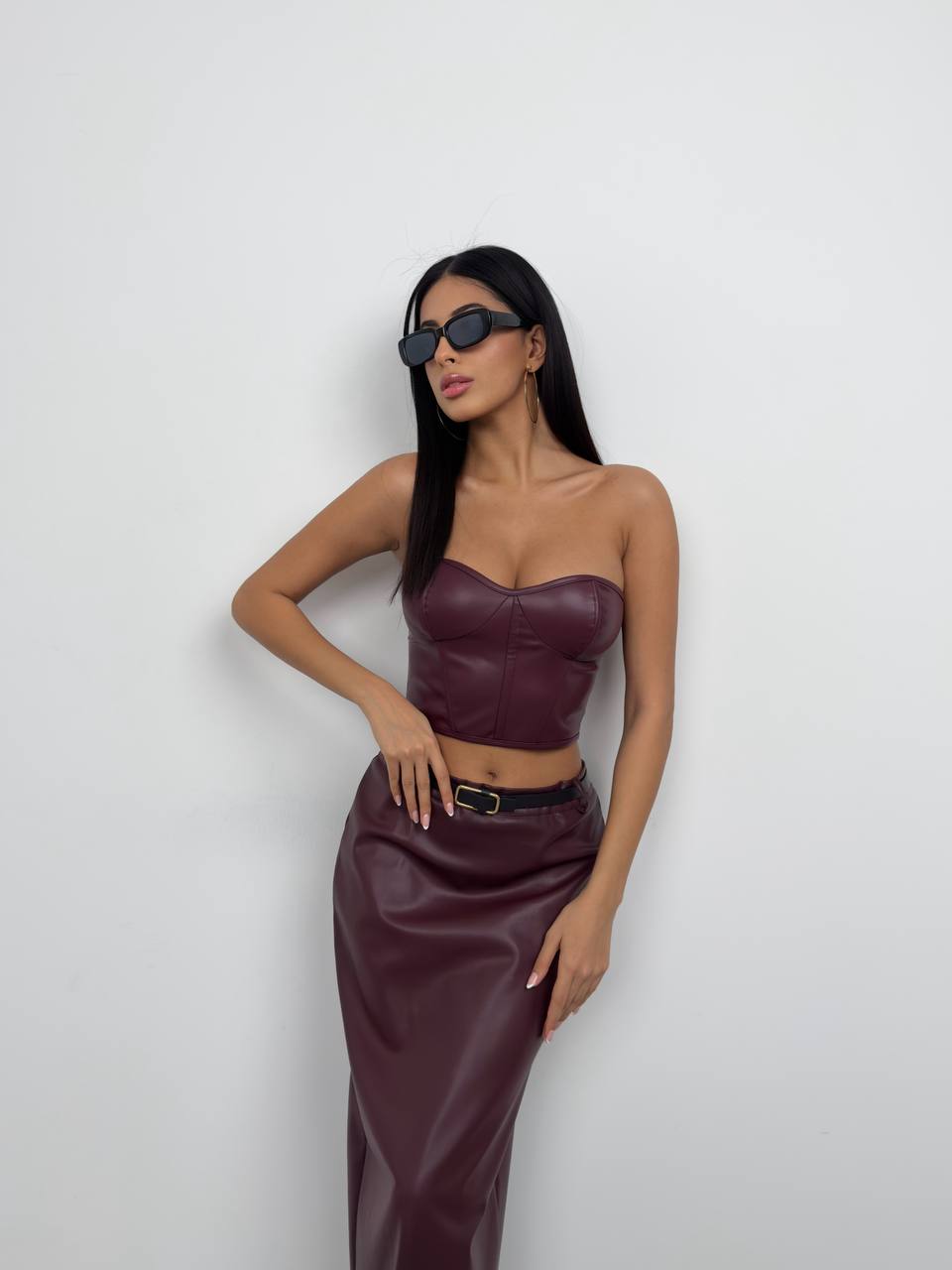 Get maxing out your wardrobe with this underwire leather crop. This top is made from a burgundy faux leather material with a lace up design, you will be tapping into your feminine side whatever the occasion. It's sleeveless design and crop length are the ultimate must have. Team with some wide leg trousers or matching skirt and a pair of hoops for a full proof finish.