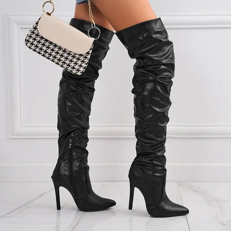 Step into the new season in style with these unreal faux leather over the knee high heeled boots, we are so obsessed. Perfect for dressing up or down, these over the knee high heeled boots are all you need to set major trends. Team with some hot pants and your fave shirt for a date.