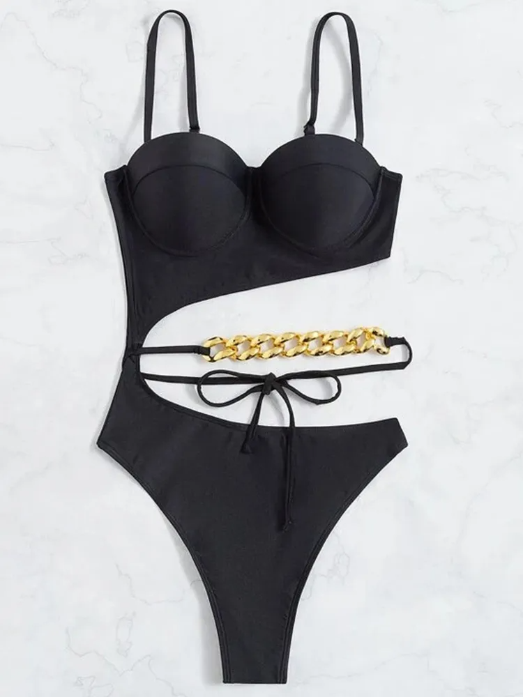 Asymmetric Gold Chain Detail Swimsuit