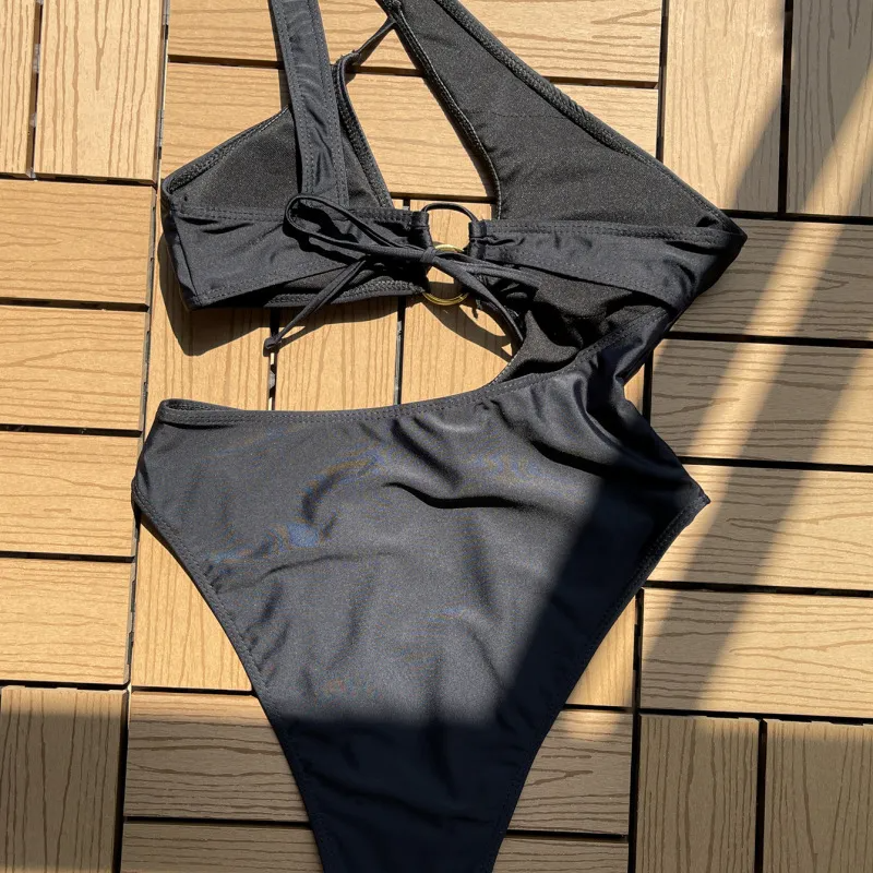 Black Asymmetric Cut Out Detail One Strap Swimsuit
