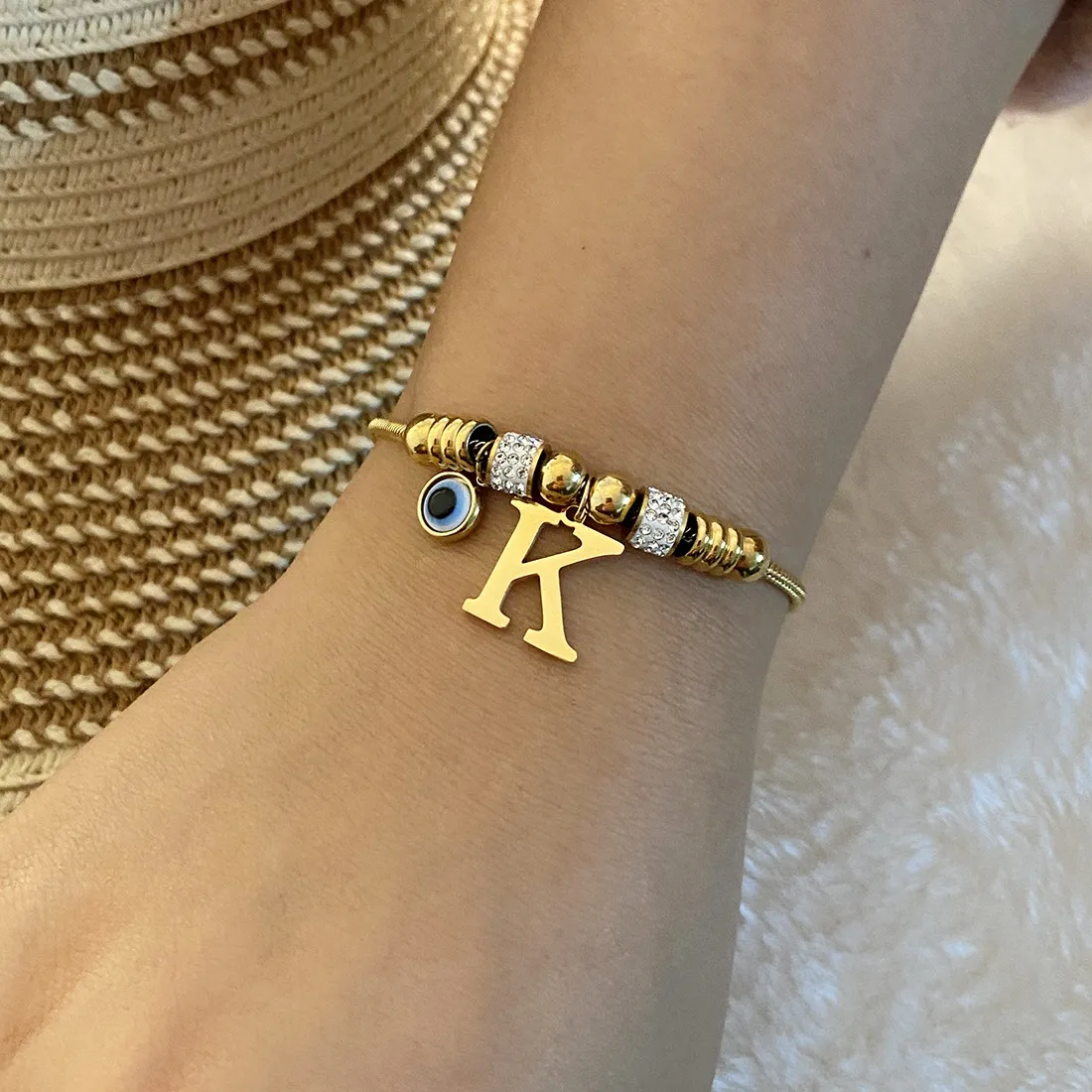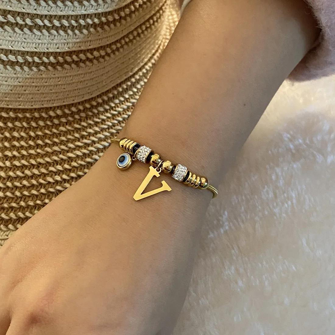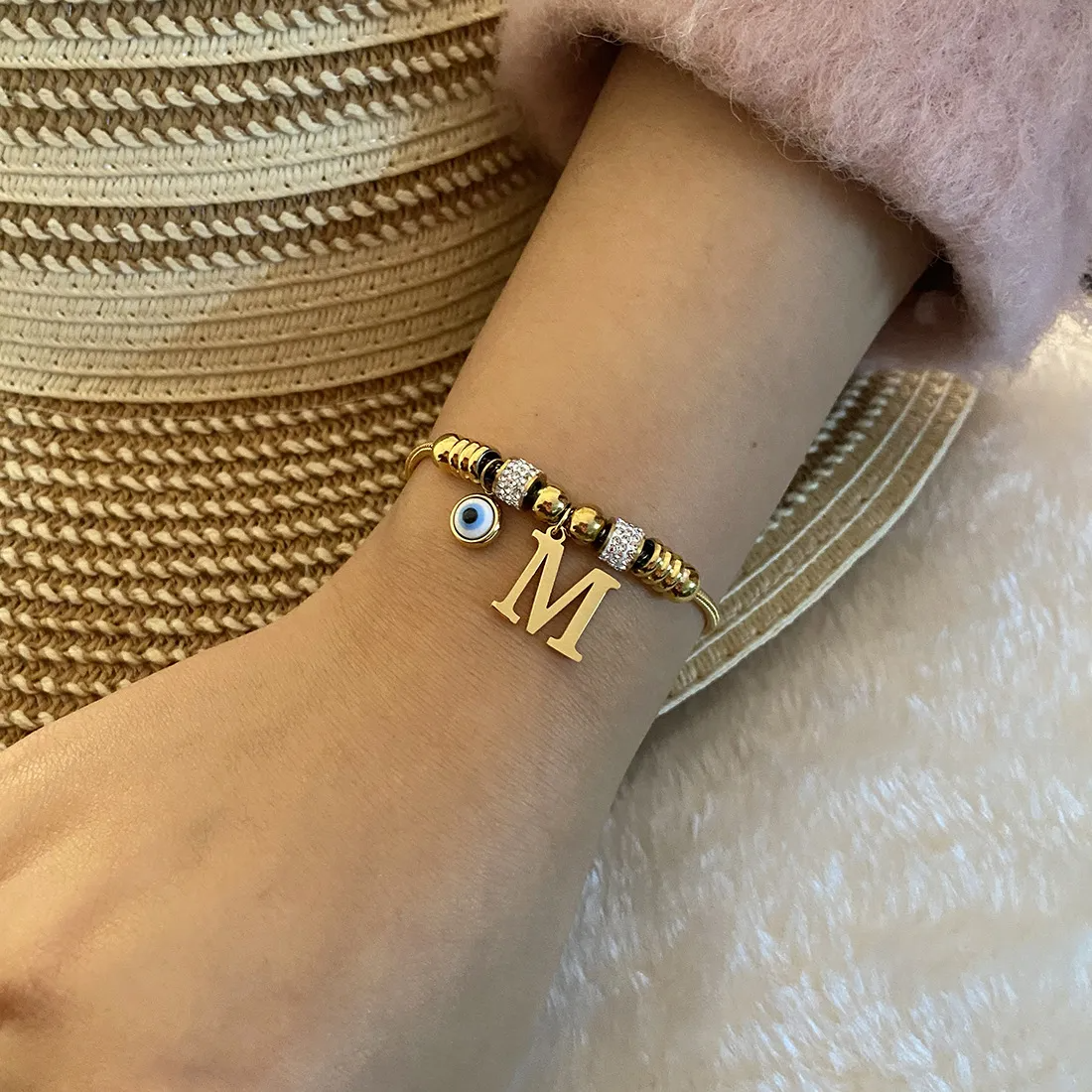 Take your outfit of the day to new heights with this alphabet 26 english letters evil eye bracelet, we're seriously in love. Team this bracelet with your fave new season fit for a flawless finish.
