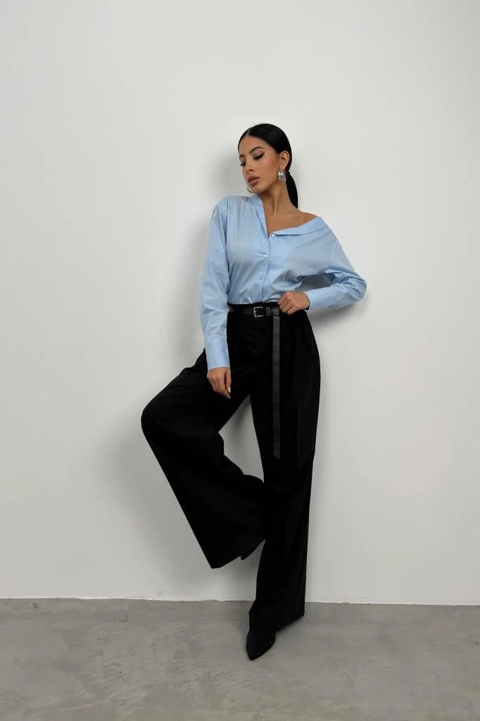 Doll, this shirt is at the top of our wishlist right now. Featuring a light blue woven material. Pair this effortlessly with trousers and platform sandals for a summery vibe.