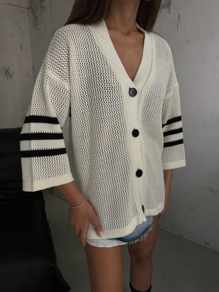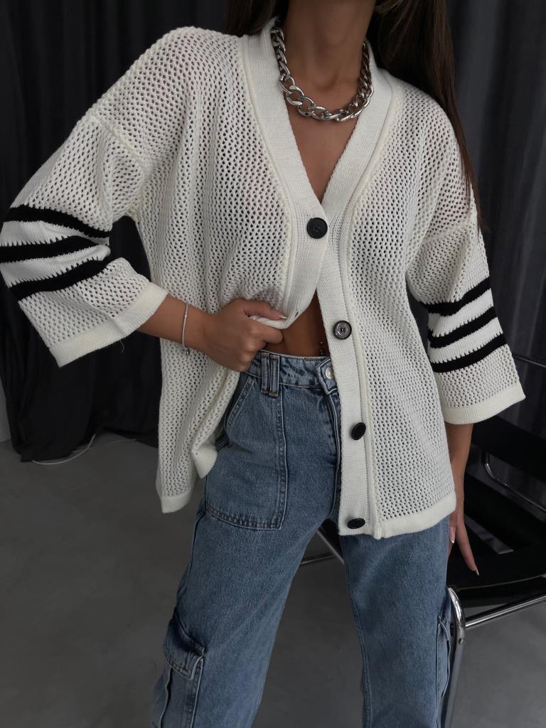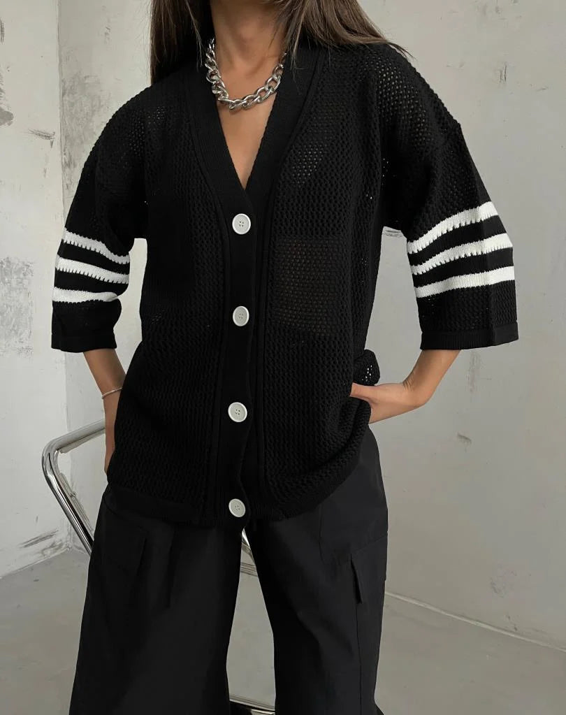 Add some edge to your off-duty wardrobe with this openwork cardigan. If it's a chilled day at home or running your everyday errands this cardigan has you covered. Brought to you in a black and white material with a V neck design and, how could you say no? Pair effortlessly with black denim jeans, gold accessories and box-fresh kicks for an everyday look like no other.