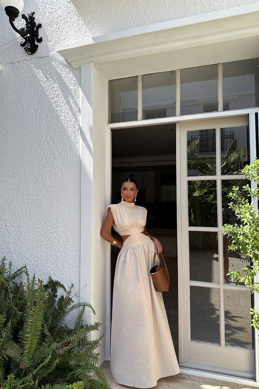 Take the stress out of everyday styling with this long dress. Brough to you in a beige soft touch material with a high neck design and a maxi fit, how can you resist? Perfect for dressing up or down to suit any occasion, this maxi dress is sure to be a staple in your new season wardrobe. Just add trainers and your go-to accessories for a full-proof finish.