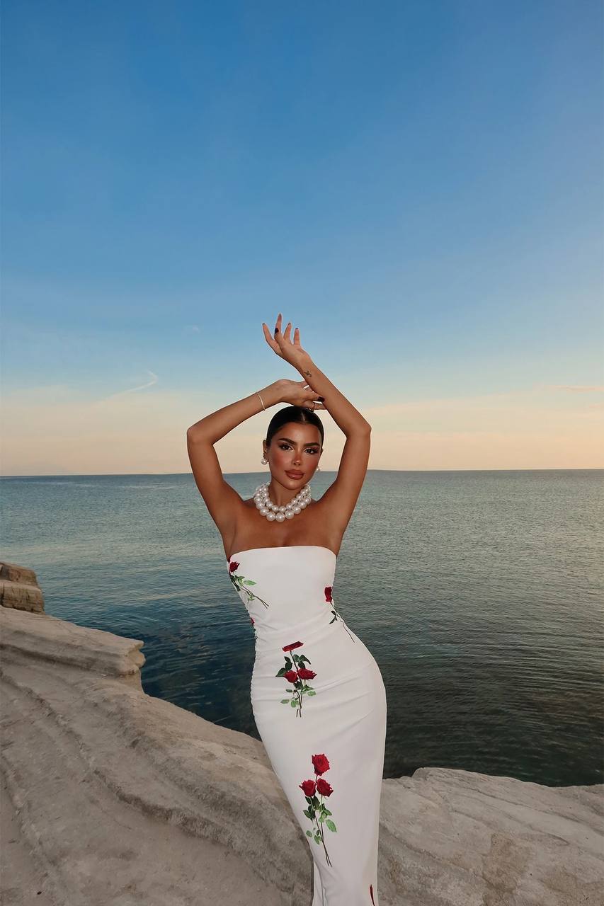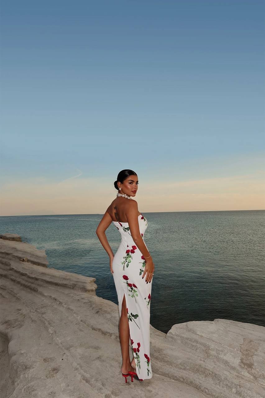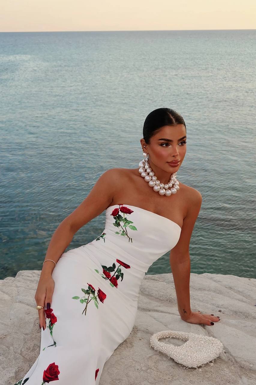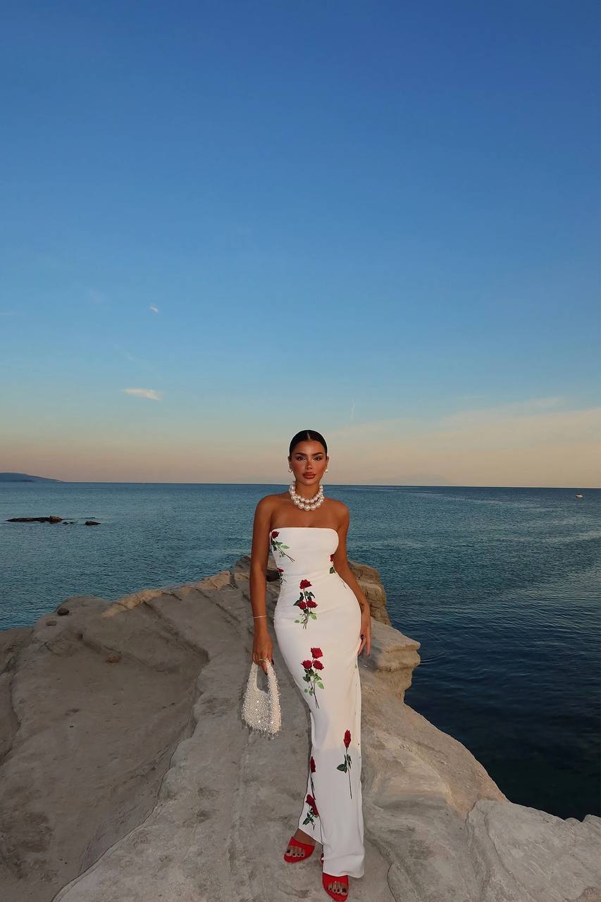 Give your look a serious update with this maxi dress. Featuring a rose print material with a strapless design and a maxi length, what's not to love? Style this with barely-there heels and minimal accessories for an occasion worthy combo we're loving.